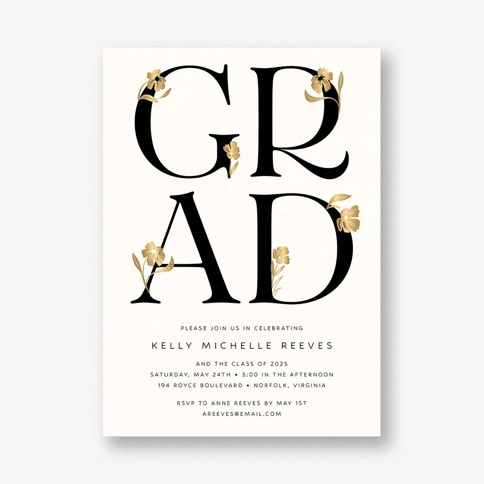 These shimmering foil florals and modern type make your big news tr??s chic.