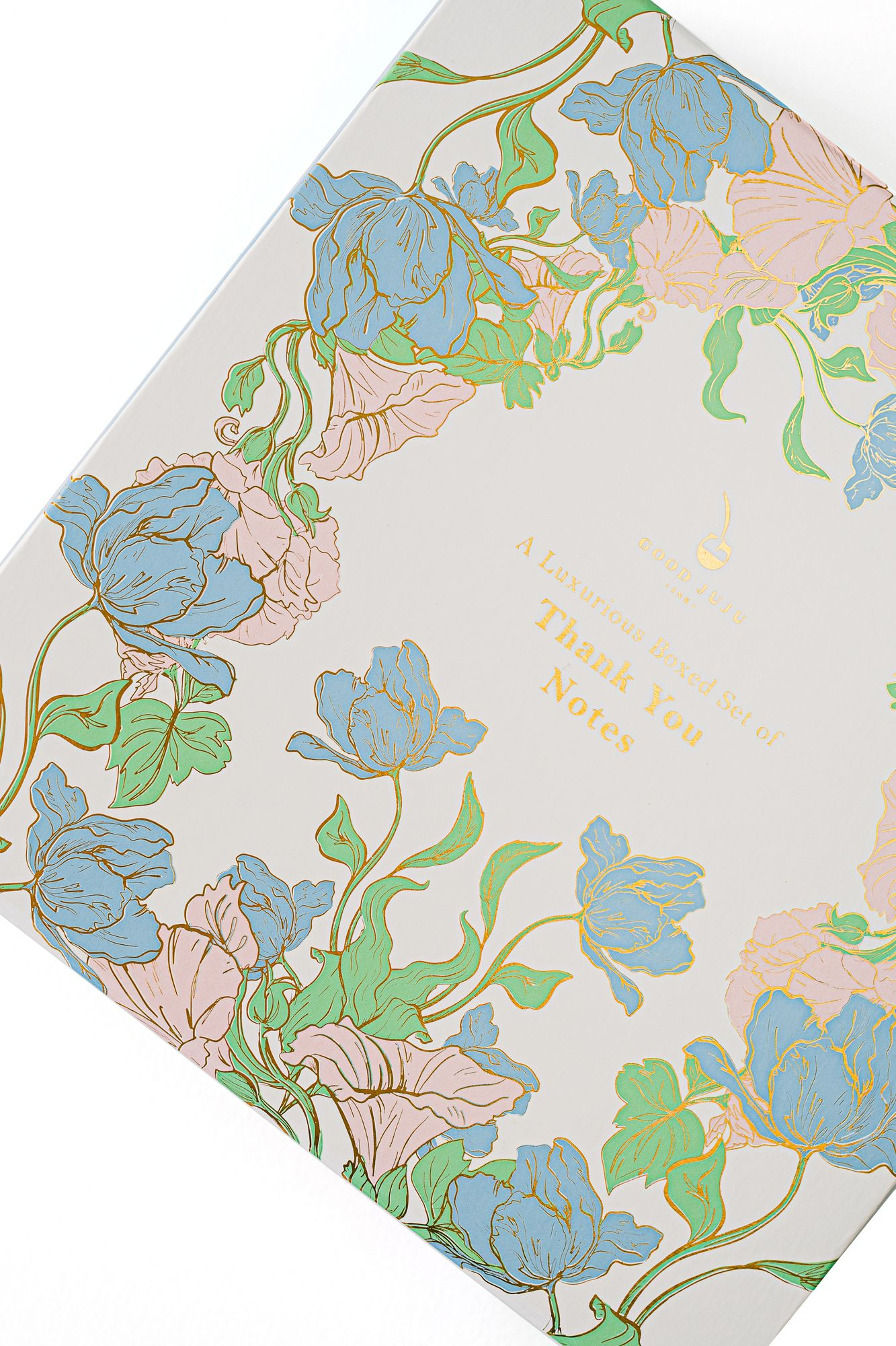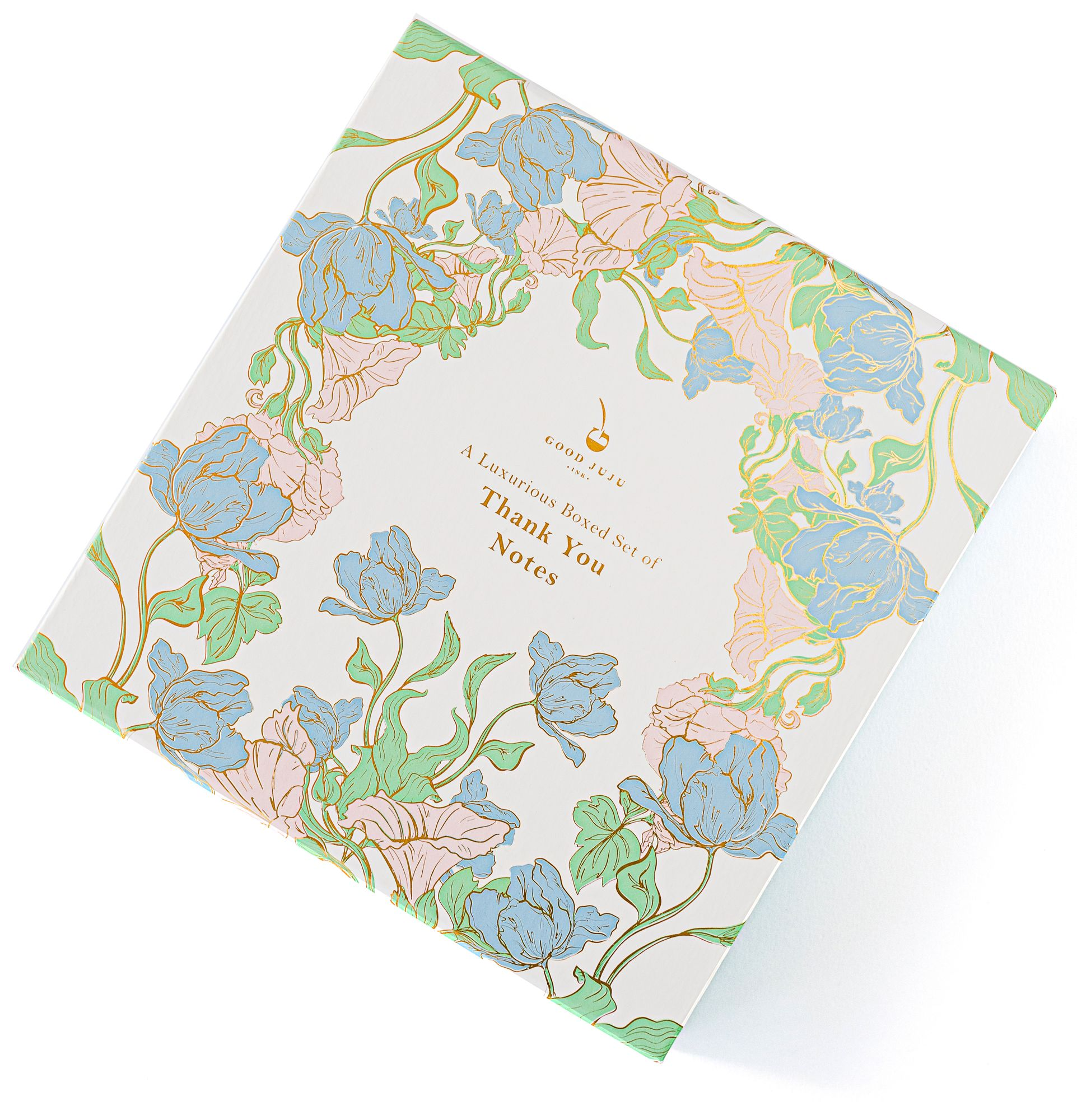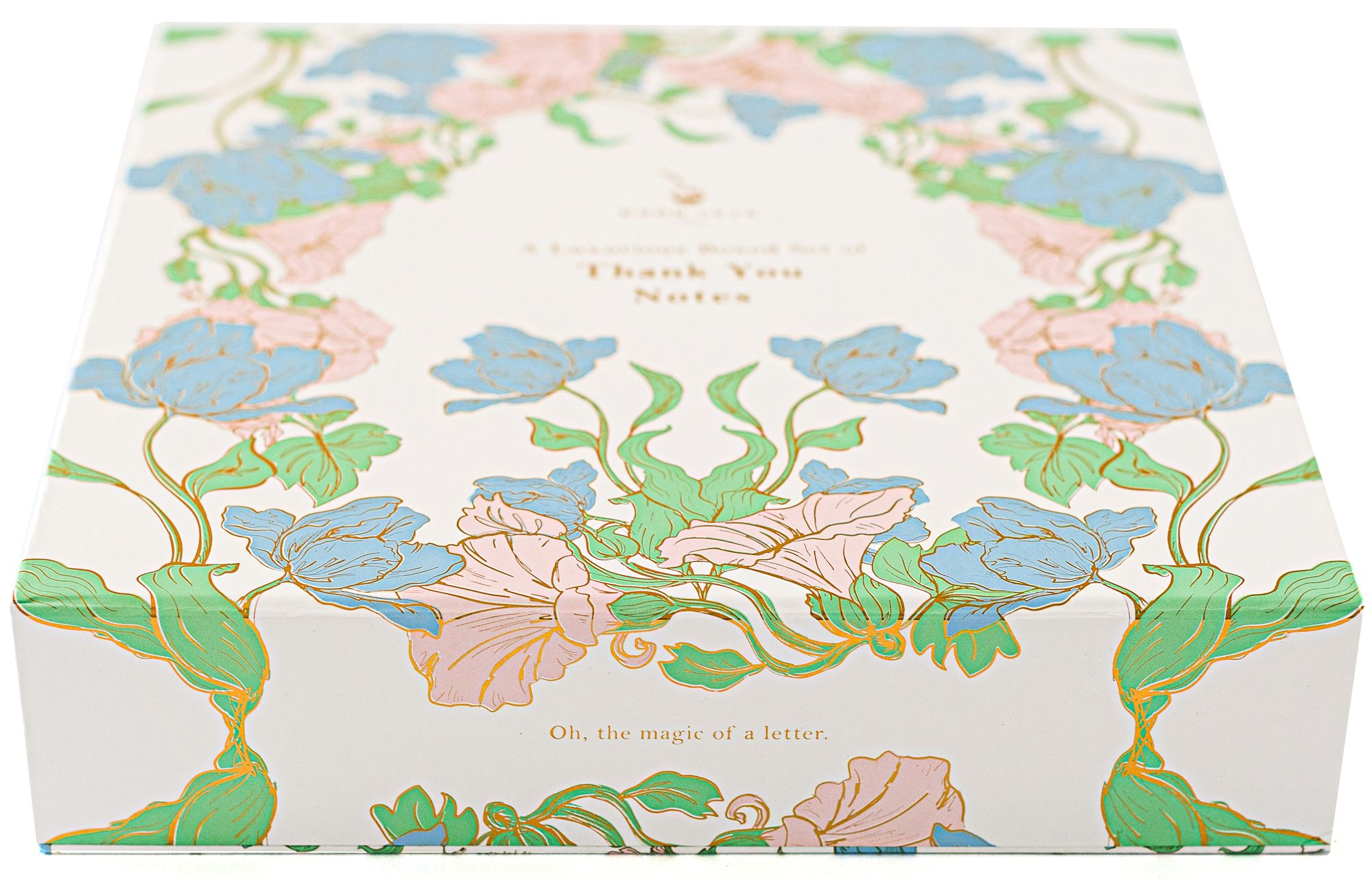 Looking for a luxurious way to say thank you? Use this gorgeously illustrated stationery set to share your gratitude. Each set comes in a stunning gold-foiled keepsake box with magnetic flap closure and includes: