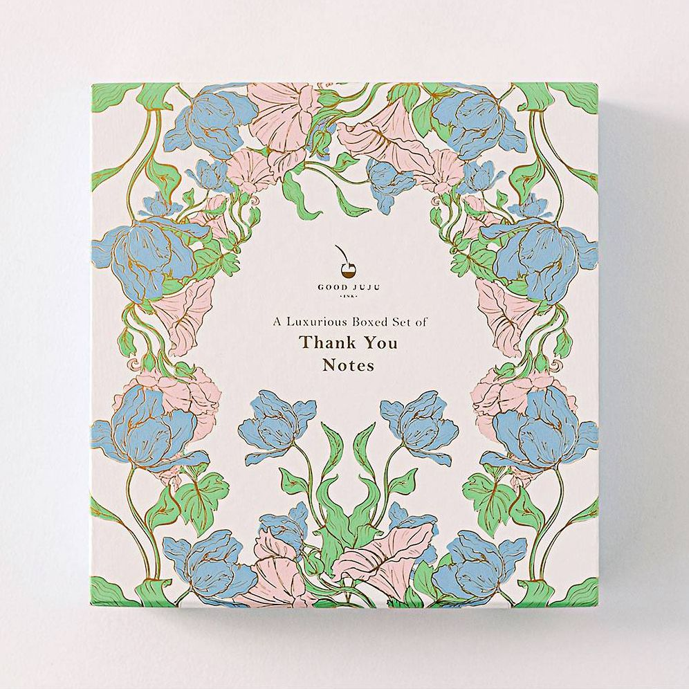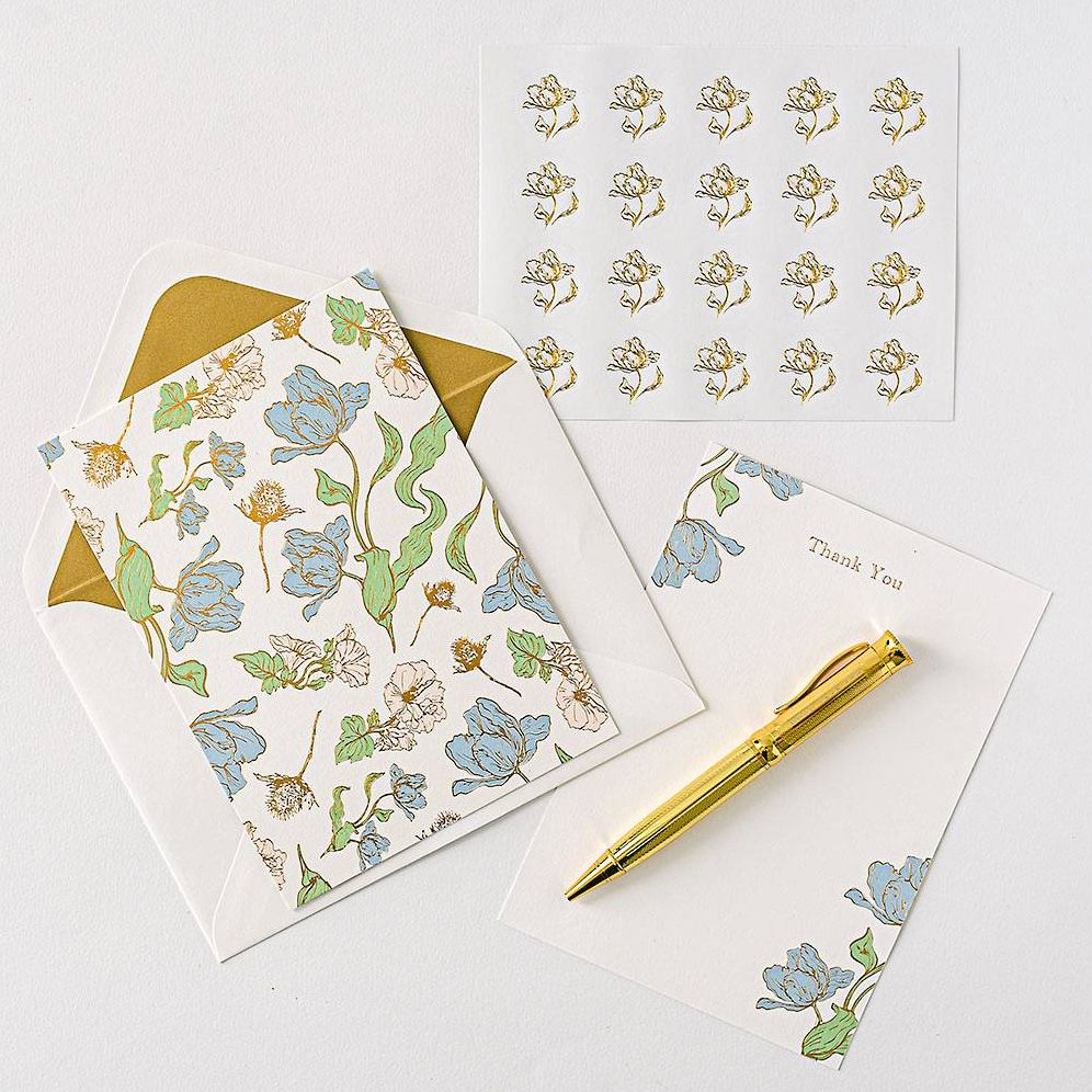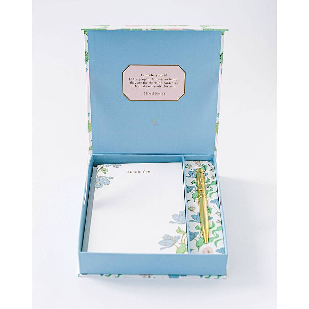 Looking for a luxurious way to say thank you? Use this gorgeously illustrated stationery set to share your gratitude. Each set comes in a stunning gold-foiled keepsake box with magnetic flap closure and includes: