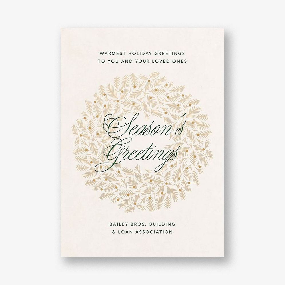A classic wreath meets modern design on this elegant holiday card. Printed on Mohawk 120.0 lb Superfine Ultra White. This paper is FSC certified. with 30% post consumer recycled content. and made using wind power.