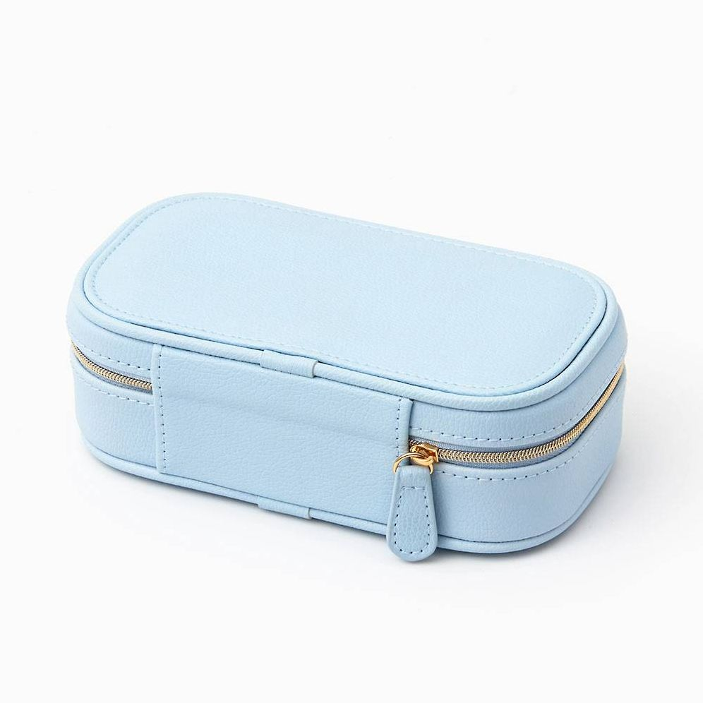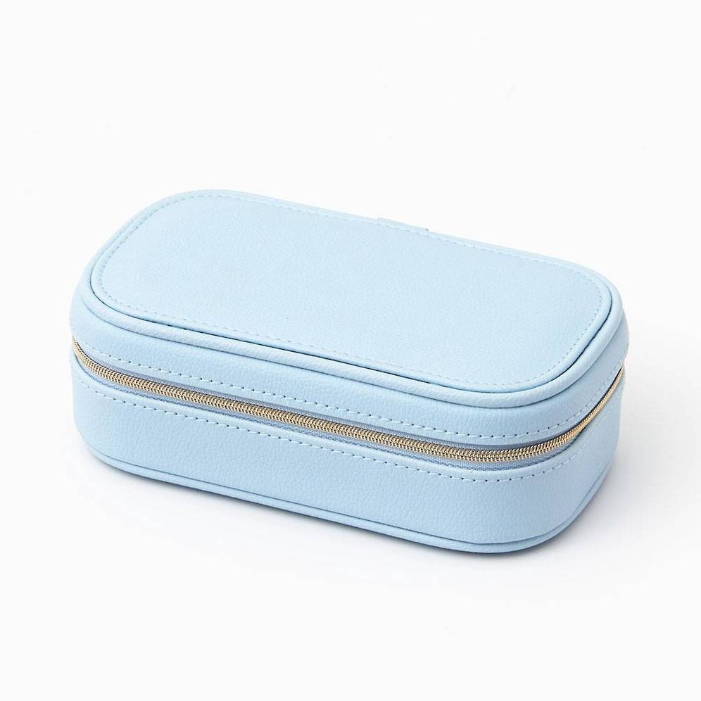 This light blue vegan leather travel zip around jewelry case is perfect for keeping your bits and bobs safe either while on the road or as an accent on a side table or dresser! Mirrored on the inside with spaces for all your rings. chains and special pieces.