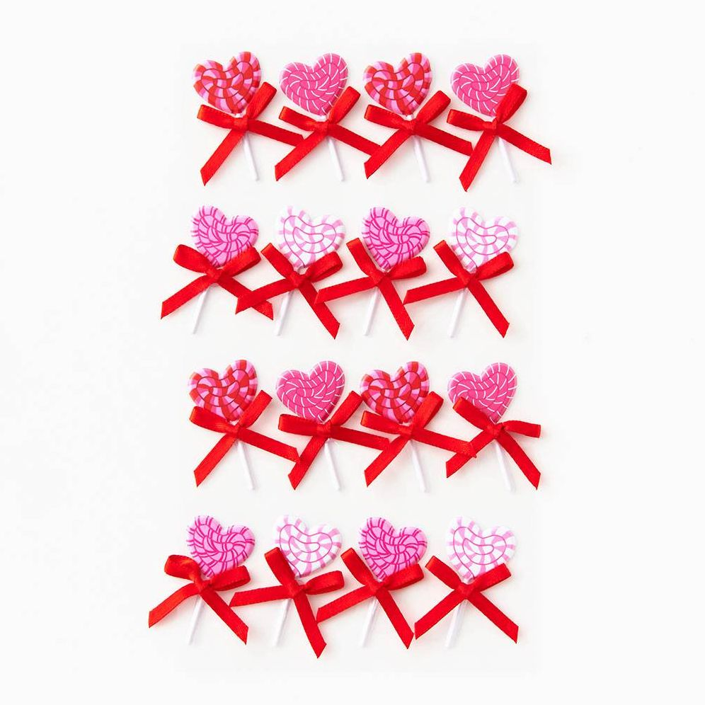 These adorable puffy heart lollipop stickers have a cute bow embellishment. Set of 24.