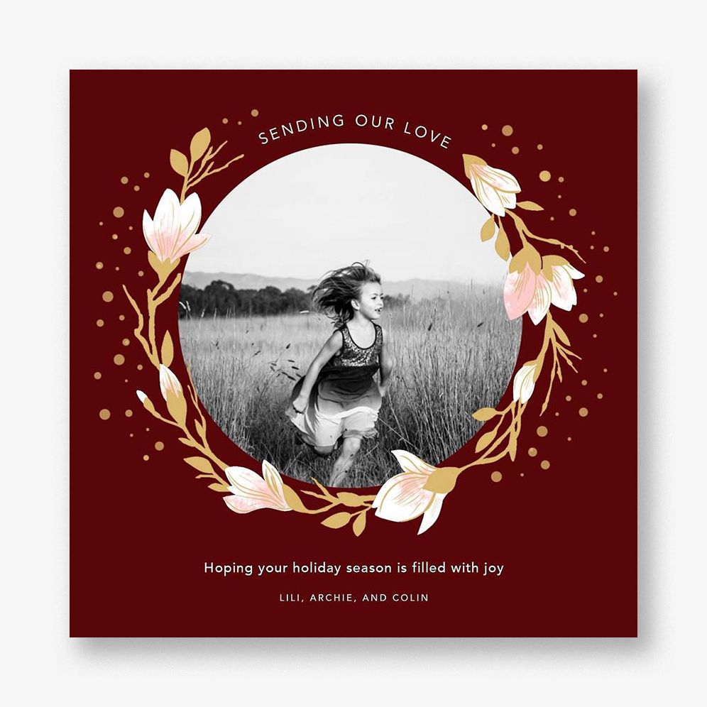 Your photo in circular orientation is framed by magnificent magnolias on a beautiful square card from Paperless Post.