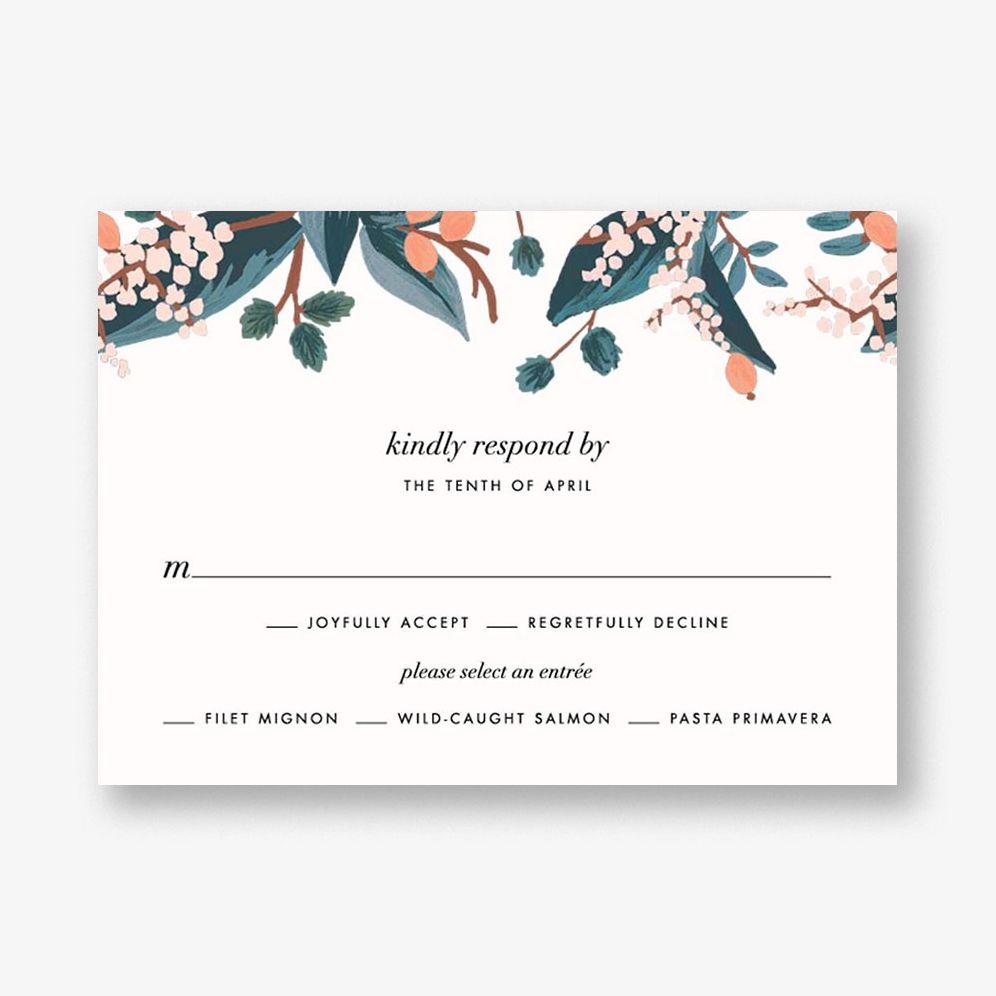 This white wedding response card is layered with navy font and beautiful florals that will wow your guests. This Rifle Paper Co. for Paperless Post design features a cluster of florals in the top right corner with peachy blooms and leafy greens in cool tones. Printed on Mohawk superfine white 130 lb. card stock that is soft to the touch and matches our superfine white envelopes. Paper is FSC certified and made using wind power.