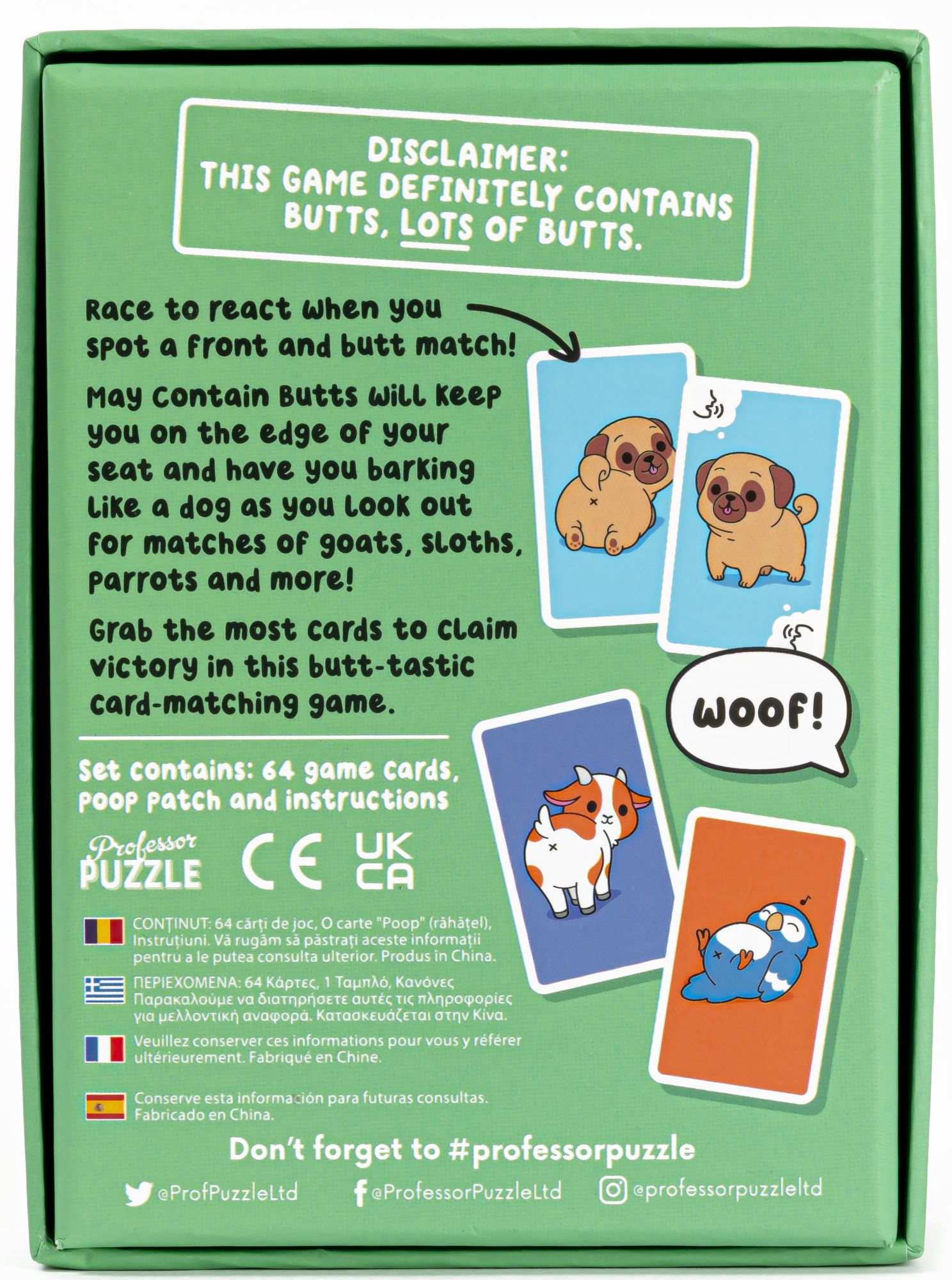 Race to react when you spot a front and butt match! May Contain Butts will keep you on the edge of your seat and have you barking like a dog as you look out for matches of goats. sloths. parrots and more! Grab the most cards to claim victory in this butt-tastic card-matching game.