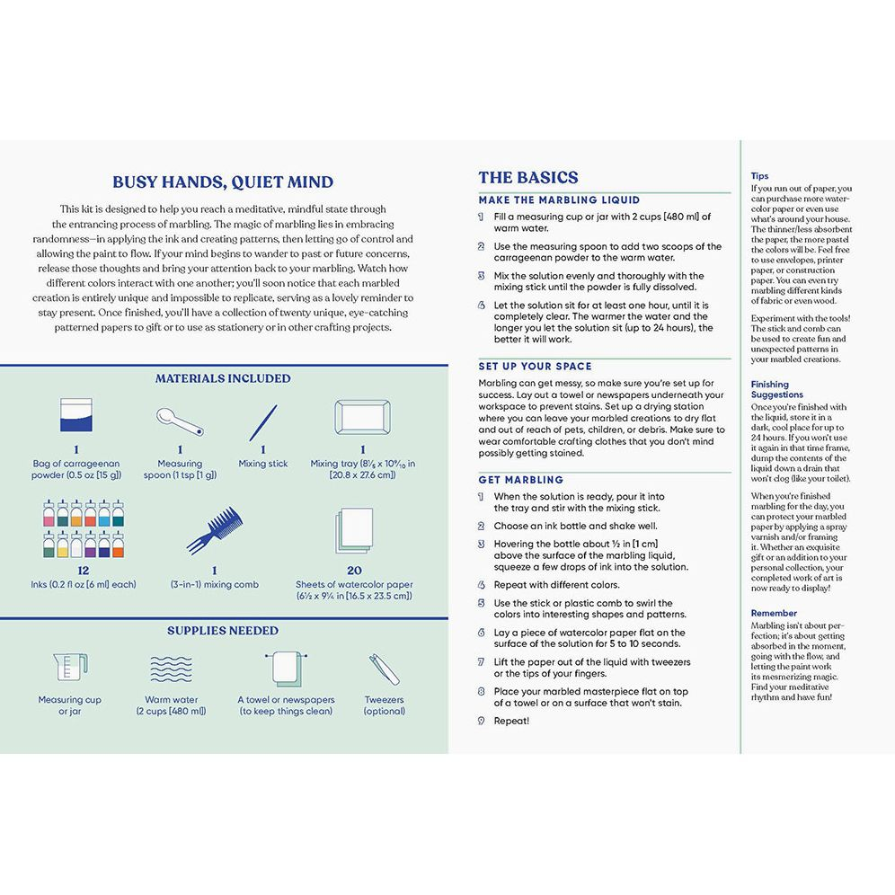 This kit includes one mixing tray. 12 paints. 20 sheets of paper. carrageenan powder and a measuring spoon. one stirring stick. a three?sided comb. and an instruction sheet with tips and tricks for marbling paper (and any other materials you may have at hand. such as fabric or wood).?With this handy kit. you can simultaneously soothe anxious thoughts and create unique marbled designs cool enough to gift or display. (Kit includes twenty sheets of paper. but paints can be used for many more projects!)
