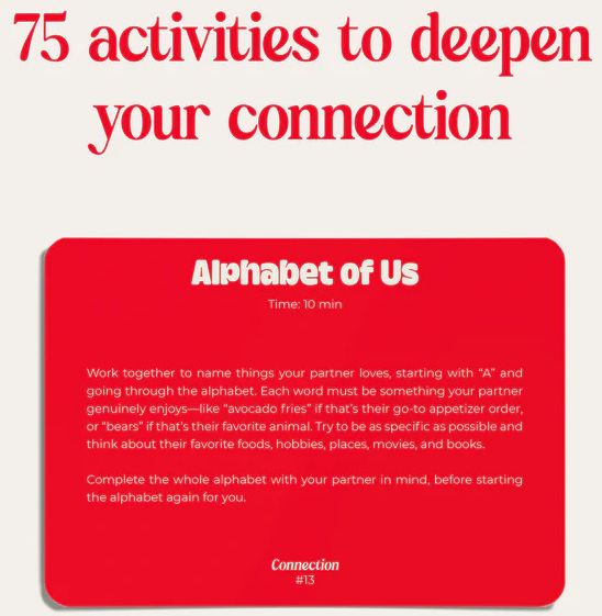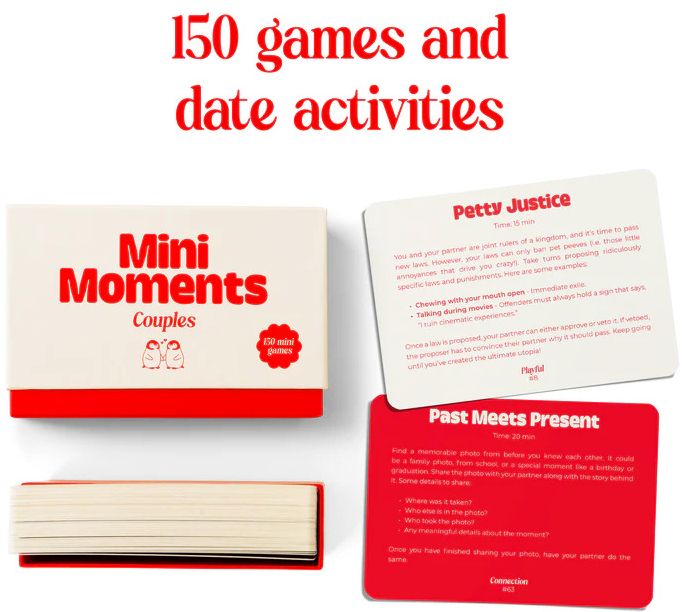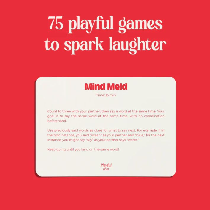 Explore 150 thoughtfully designed mini games to create moments of fun. laughter. and intimacy with your partner. Games are divided into two categories: ‘Playful’ mini-games that bring out your silly side and ‘Connection’ mini-games that deepen your bond. With quick-to-learn rules and a range of game lengths. there’s always a perfect mini moment waiting for you.