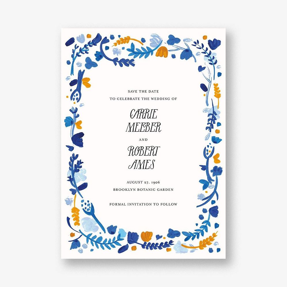 Give guests plenty of time to mark their calendars with these lovely Save the Date cards. Like the matching wedding invitation. this hand-painted design features a floral motif in shades of blue and yellow. Important details are perfectly framed in the middle.