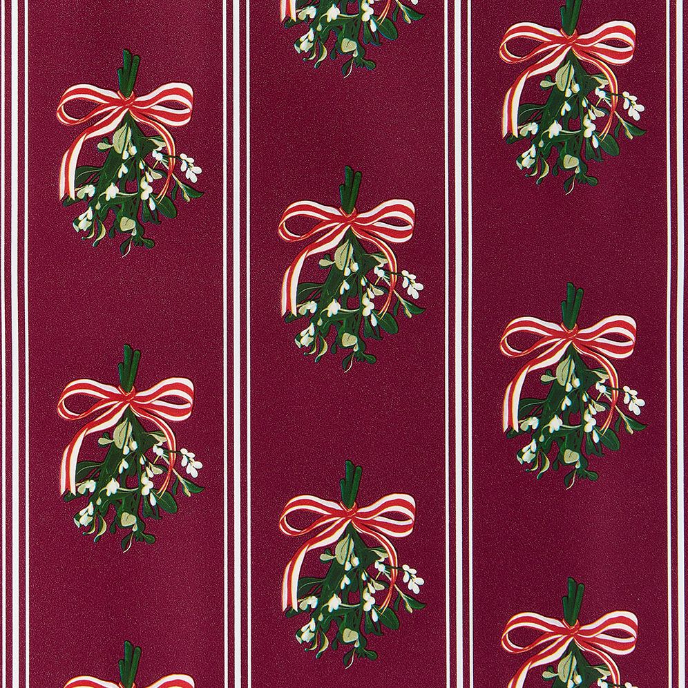 Wrap your holiday gifts for someone special in our beautiful mistletoe wrapping paper. This wrap features mistletoe bunches with bows on a deep burgundy background and sweet stripes to tie it all together. Add a gift tag. bow or ribbon to complete your beautifully wrapped gift! Roll measures 10′ x 30. Designed by Paper Source