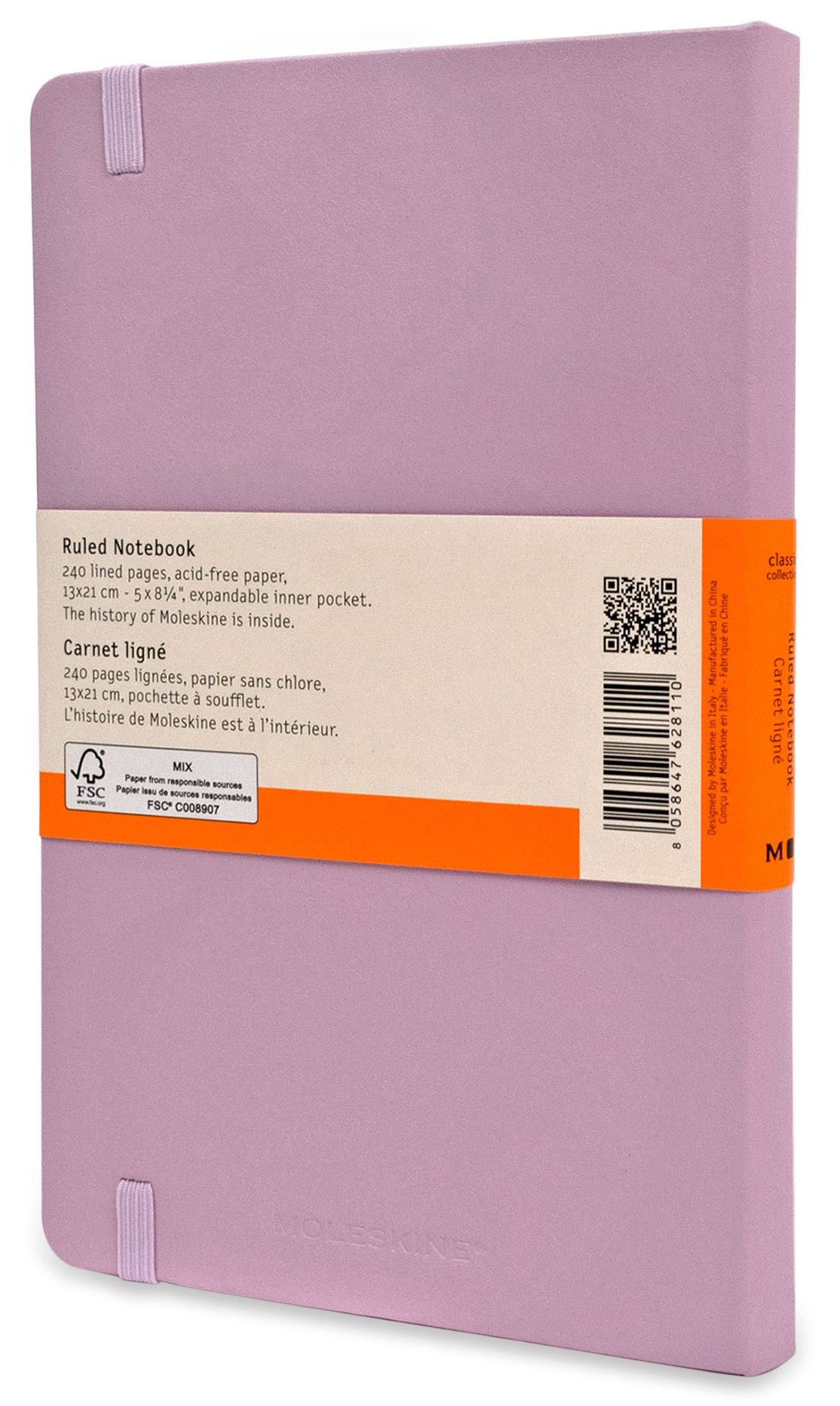 This basic. yet classic Large Ruled notebook is one of the bestselling Moleskine notebooks. This reliable travel companion. perfect for writings. thoughts and passing notes. has a cardboard bound cover with rounded corners. acid free paper. a bookmark. an elastic closure and an expandable inner pocket that contains the Moleskine history.