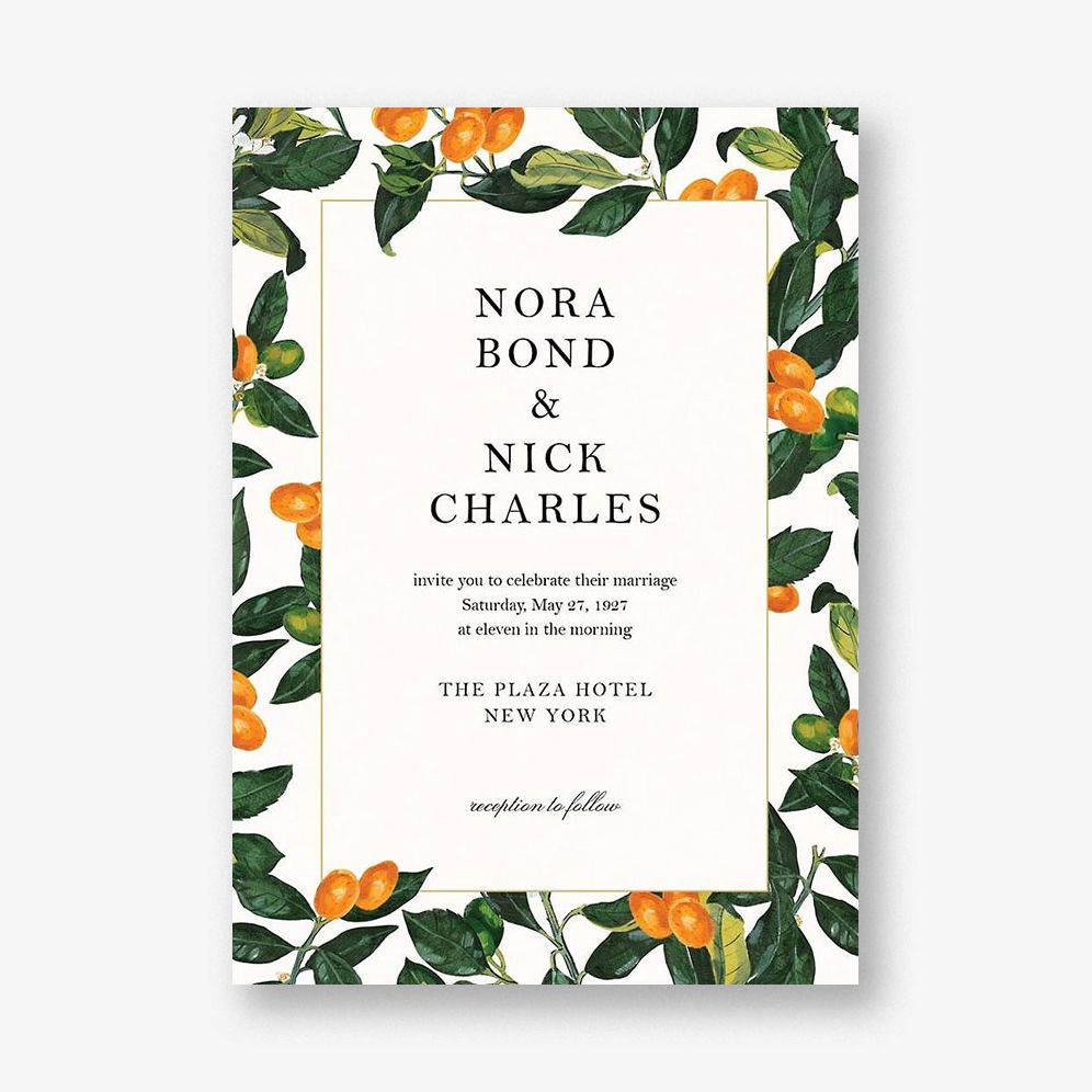 This lush invitation from Oscar de la Renta takes inspiration from the delight of a fragrant orchard. perfect for an elegant affair. Printed on Mohawk superfine white 130 lb. card stock that is soft to the touch and matches our superfine white envelopes. This paper is FSC certified. with 30% post-consumer recycled content. and made using wind power. Running low on time? You can with our partners at Paperless Post.