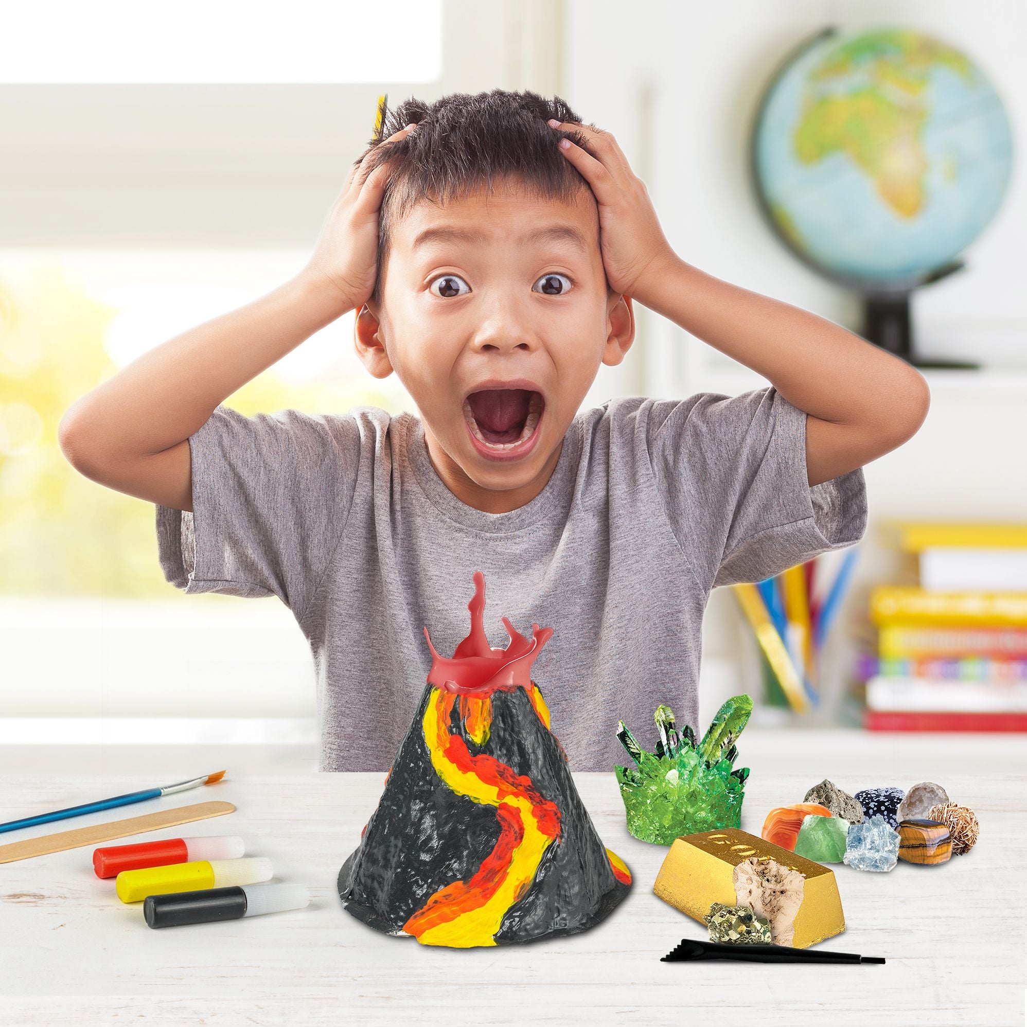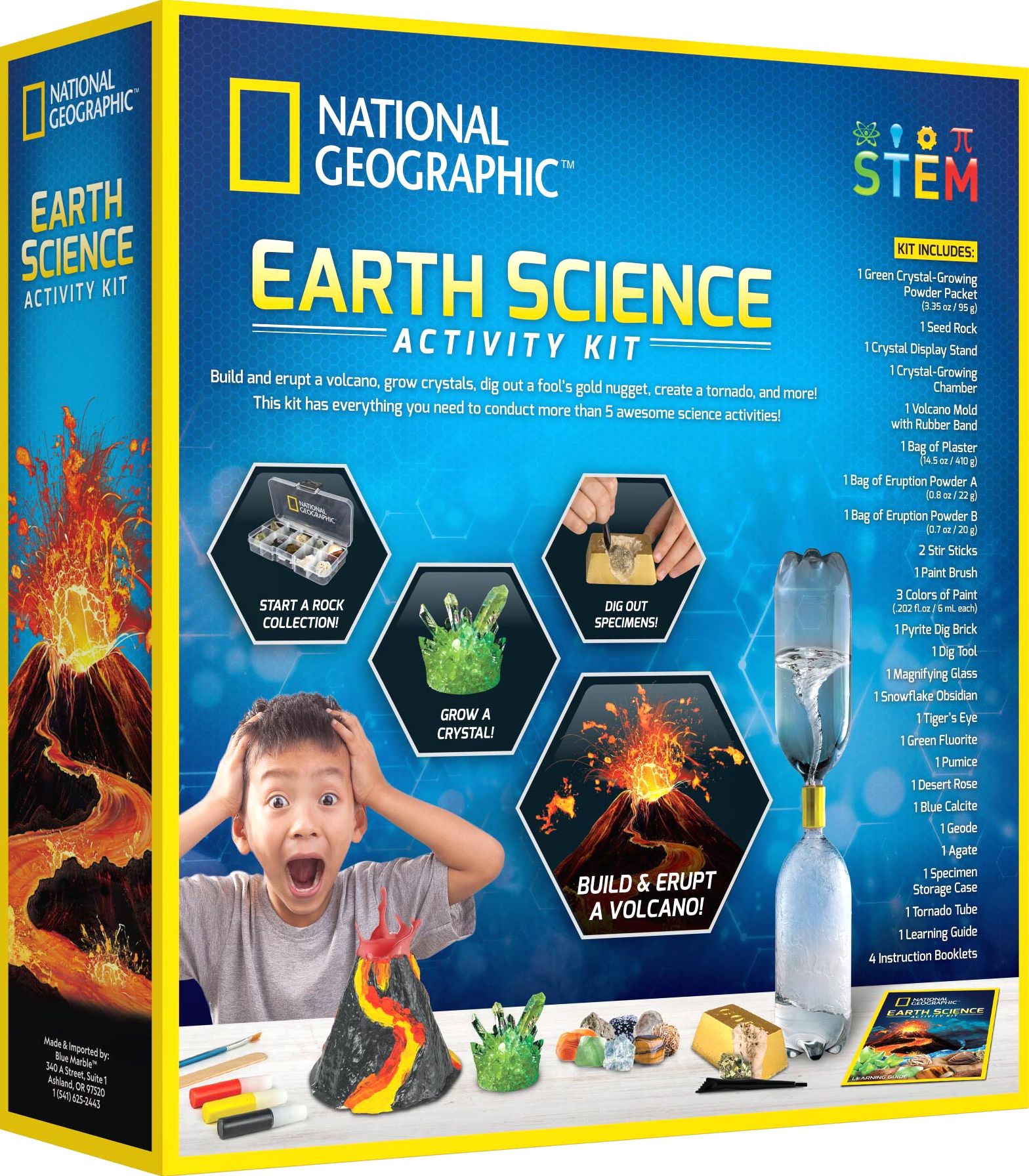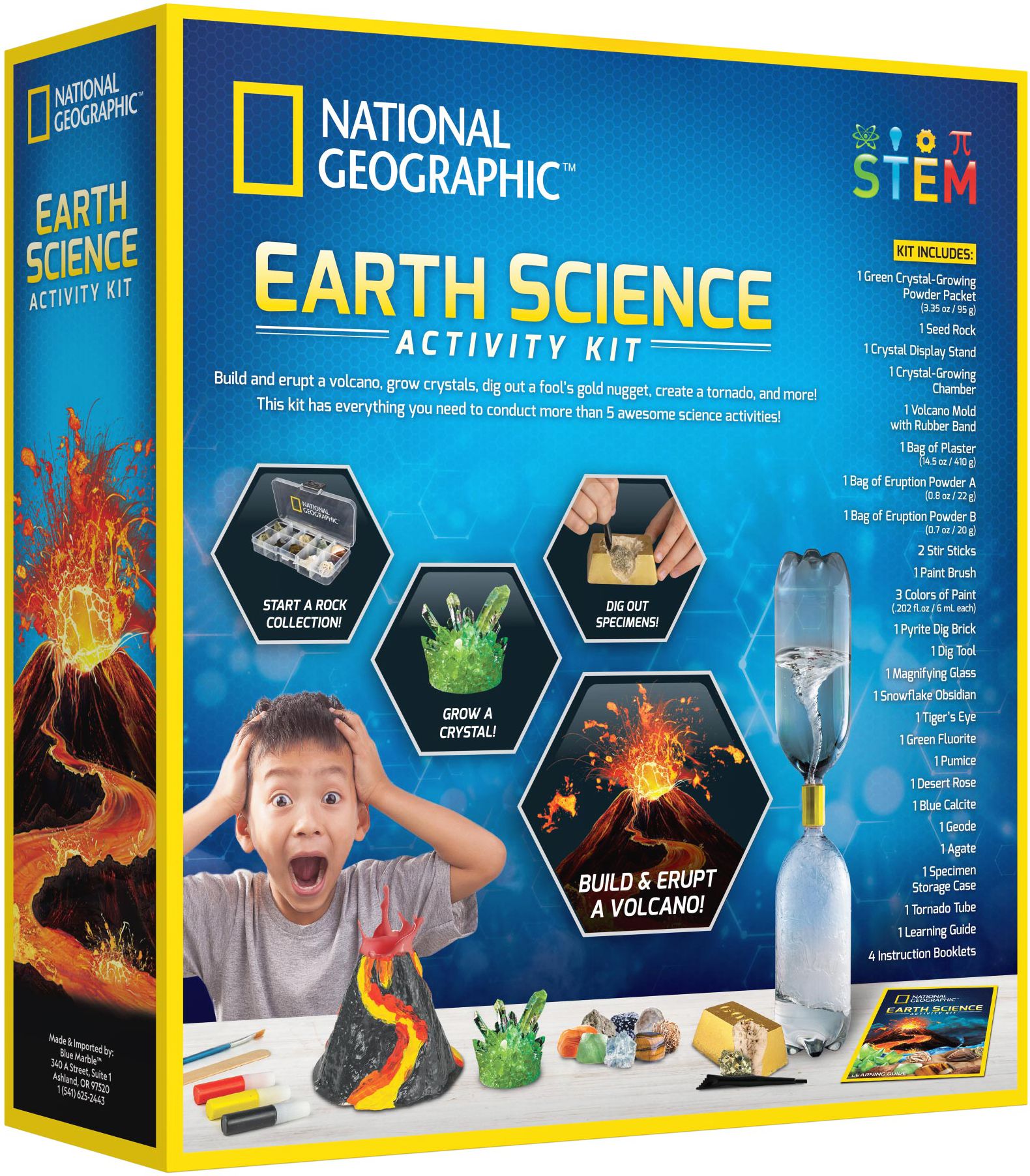 The National Geographic Explorer Science Series Earth Science Kit is a must-have for any promising young scientist!Kids will love making their very own erupting volcano. experiencing the magic of chemistry as the eruption powder reacts with water. Looking for another eruption formula? There are multiple variations to try in the clear. easy-to-follow instructions.They will also be amazed as a potion of water and crystal-growing solution grows into a fully formed crystal! Our special crystal-growing formula means crystals can fully grow in as little as 3 days!No Earth science kit would be complete without activities centered on geology. which is why there is a pyrite dig brick in the kit. Additional rock and mineral specimens in the kit are the perfect start to a rock collection. and include snowflake obsidian. tiger’s eye. green fluorite. pumice. desert rose. blue calcite. and a geode. For Ages: 8+WARNING: Choking Hazard; Small Parts. Not for children under 3 years old.