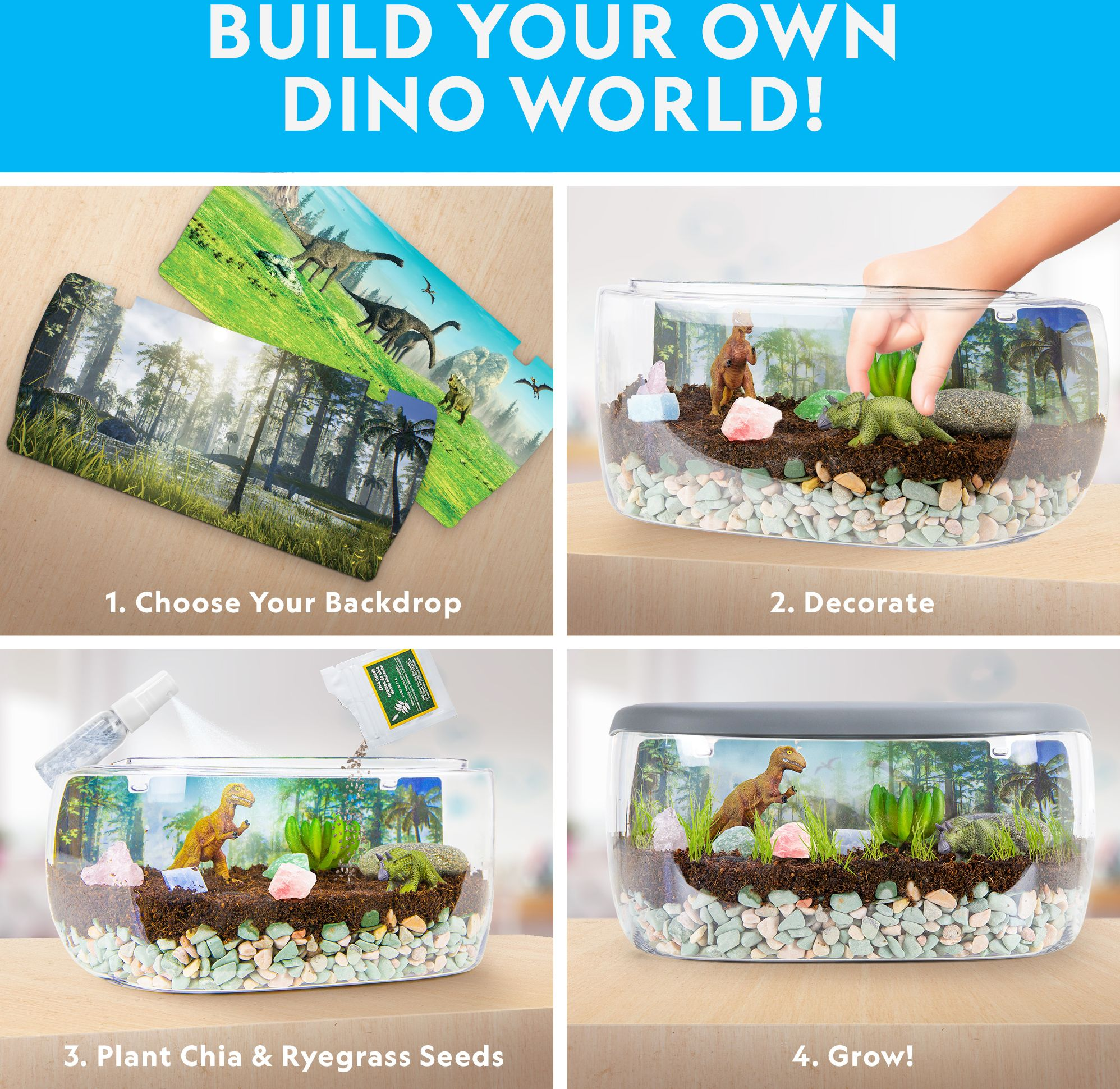 Create an amazing natural landscape using the included dirt. grass seeds. 2 dinosaurs. faux plant figures. genuine rock and fossil specimens. and a dino-themed backdrop. The wide view front profile allows for a clear view of the interior. The light-up function turns on/off via a button on the lid. Also includes a USB cable. no batteries are required.