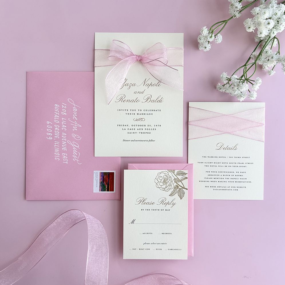 This Paperless Post design features a large area of negative space at the top of each card. allowing you the freedom to hand – customize your suite with a tied ribbon. a sash of decorative paper. a brush of metallic paint; truly any DIY element to bring your vision to your cherished guests. Make an appointment with our experienced wedding consultants to add a monogram or custom artwork from our team of designers. Printed on Mohawk superfine soft white 130 lb. card stock that is soft to the touch and matches our superfine soft white envelopes. This paper is FSC certified. with 30% post-consumer recycled content. and made using wind power. Running low on time? You can with our partners at Paperless Post.
