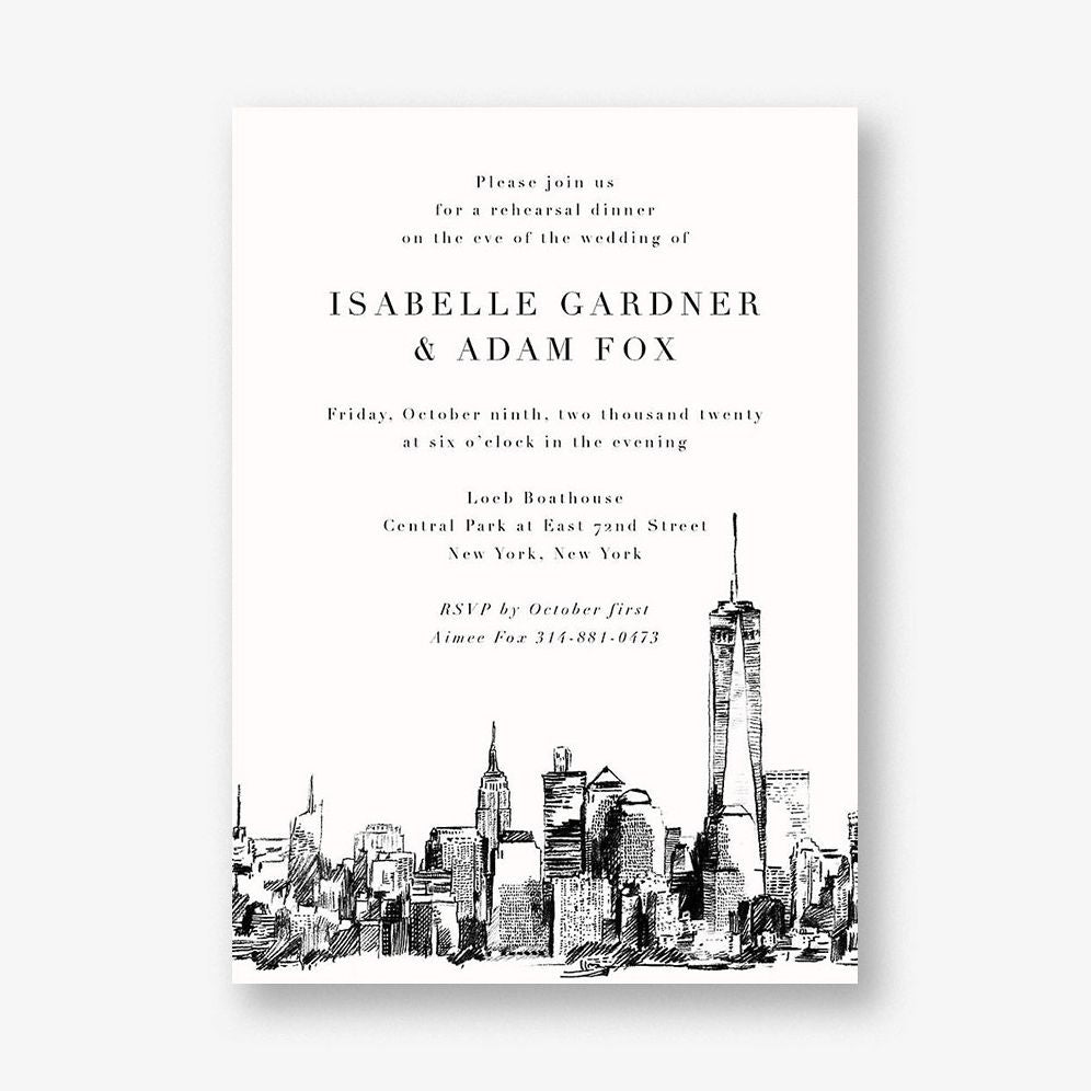 The New York Rehearsal Dinner Invitation features a sketched rendering of the awesome New York City skyline. Designed right here at Paper Source. Printed on bright white. ultra smooth 130 lb. card stock. Paper is FSC and SFI certified and made from 10% post-consumer recycled waste.
