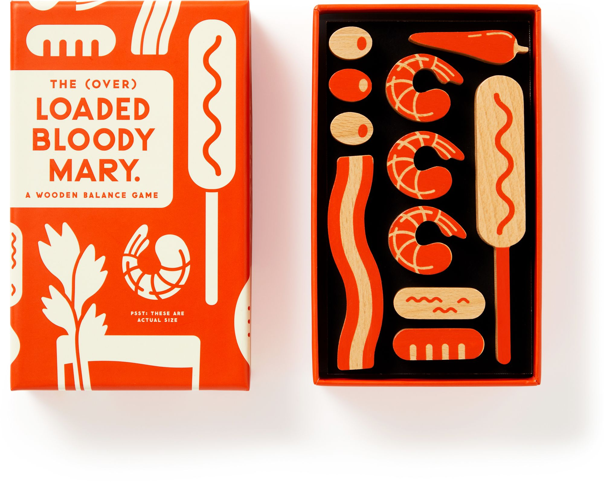HOW TO PLAY – Players complete by taking turns adding increasing ridiculous garnishes on top of a bloody mary shaped starting block?Cas they try not to be the one that knocks it all down. Includes 10 wood game pieces with double-sided printing and instruction sheet.