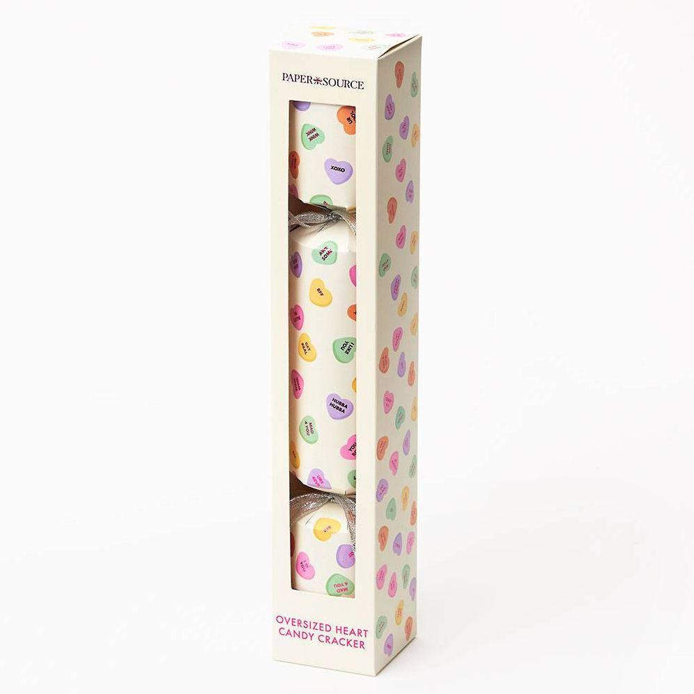 This oversized heart candy cracker is a perfect way to end a Valentine’s Day dinner. This party cracker comes with 1 mini heart sticky note. heart shaped confetti. 2 paper crowns and 10 conversation starters. Paper Source designed.