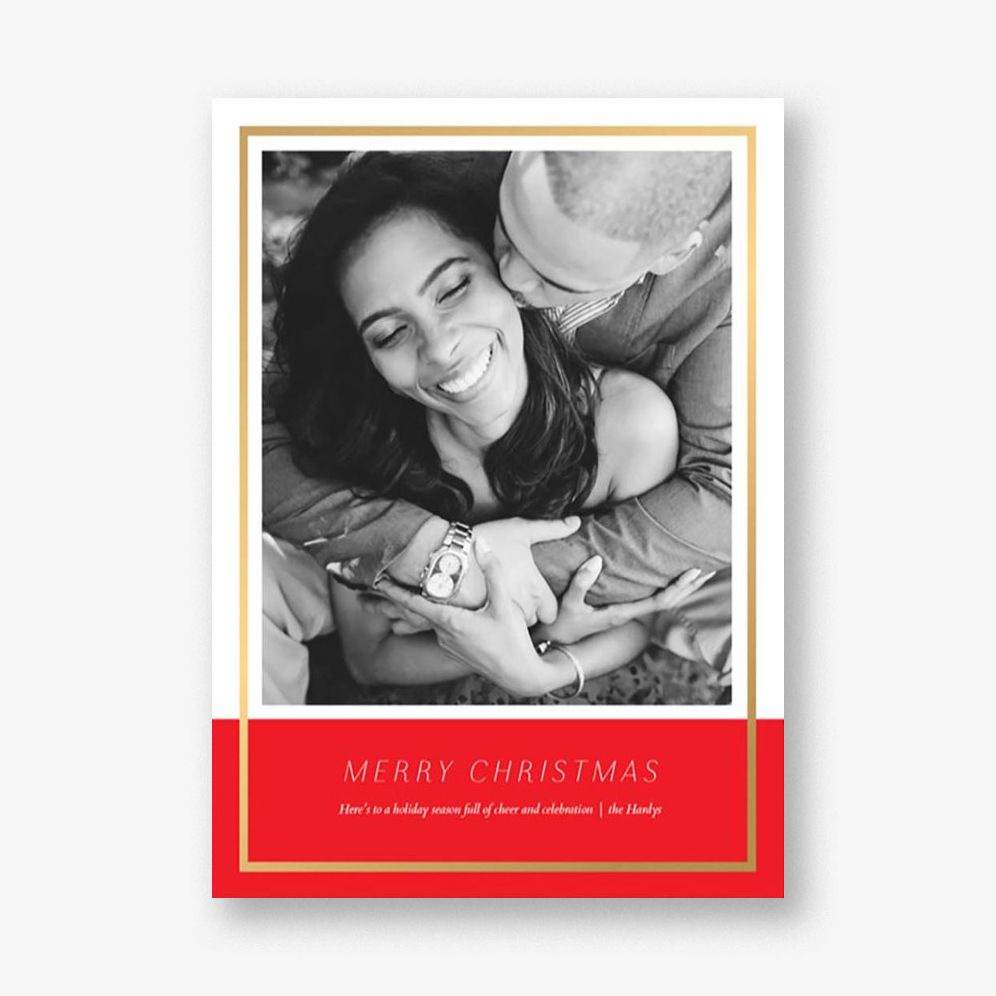 Customize this classic holiday photo card by Paperless Post. Pick a personal photo of you and your loved ones and frame it with a glistening foil of your choice. Choose a footer color and write a heartfelt message! Your personalized photo card is ready to bring smiles on the faces of your loved ones.