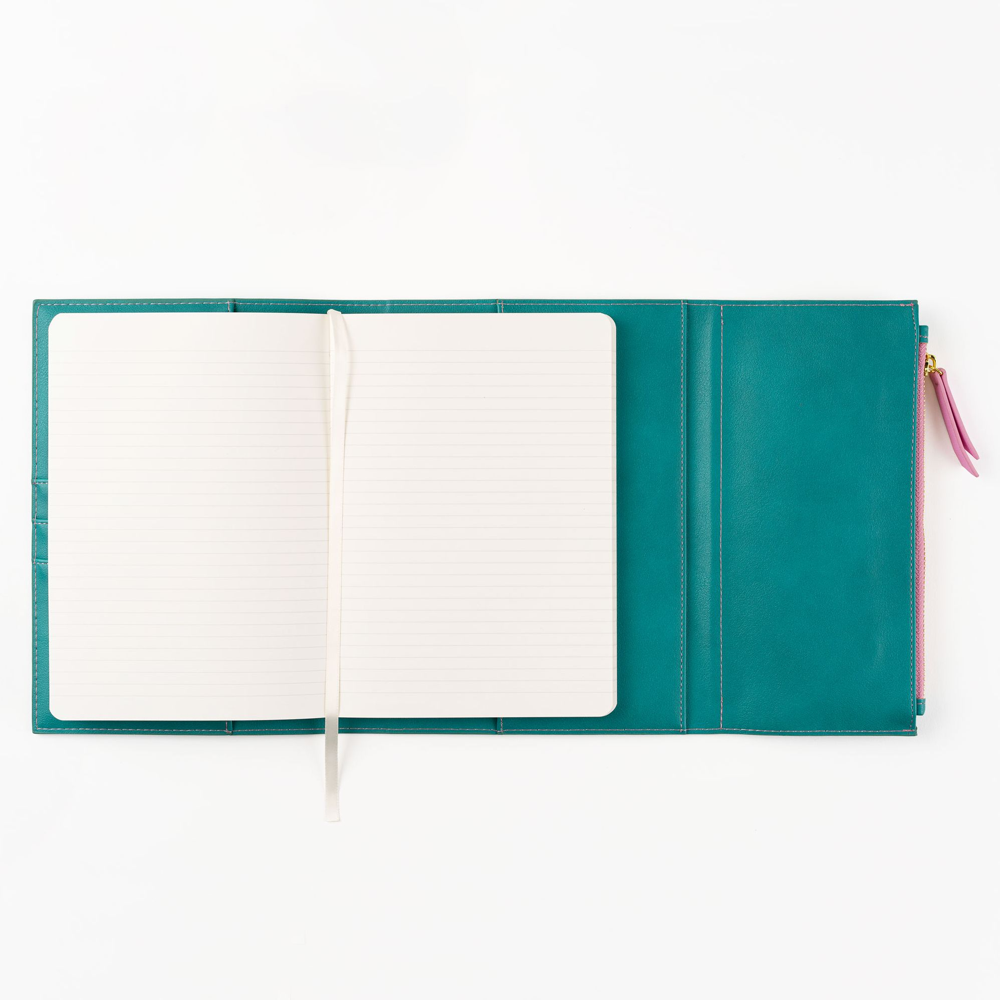 - Attached zippered pouch to fit wriing tools. and journaling accessories