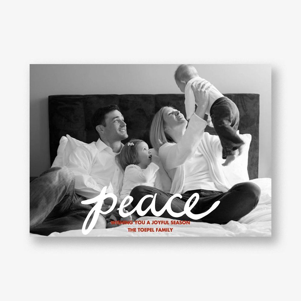 This simple design lets your photo shine. Our chunky script type gives our peaceful greeting a festive look. Printed on Mohawk ultra white 120 lb. card stock that is soft to the touch and matches our superfine white envelopes. Paper is FSC certified and made using wind power.