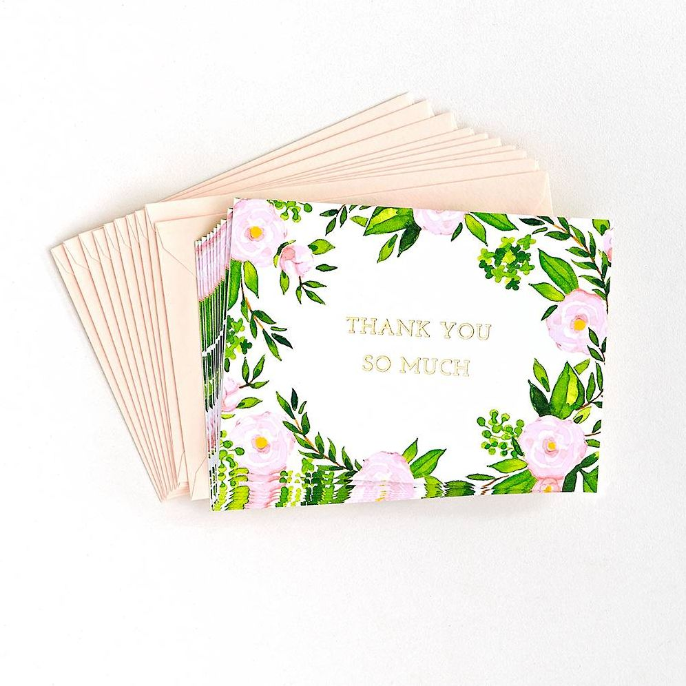 Send messages of appreciation and gratitude with this thank you card set. Pink flowers and lush greenery adorn this thank you card set. Text is printed in gold foil. Blank inside. Accompanied by envelopes. color may vary. Printed on recycled paper.