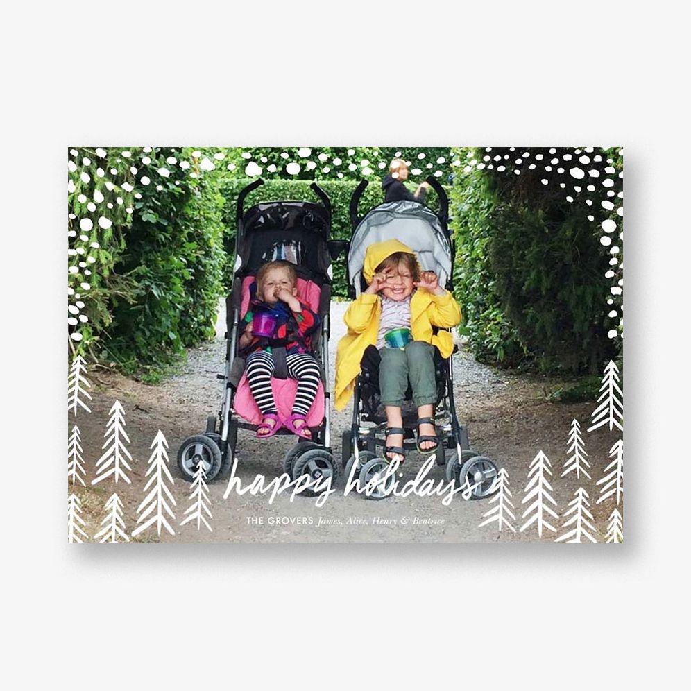 Show off your adorable munchkins this holiday season in this adorable holiday photo card by Linda and Harriett for Paperless Post. Choose a picture and feature it behind this Christmas tree and sprinkles of snow.