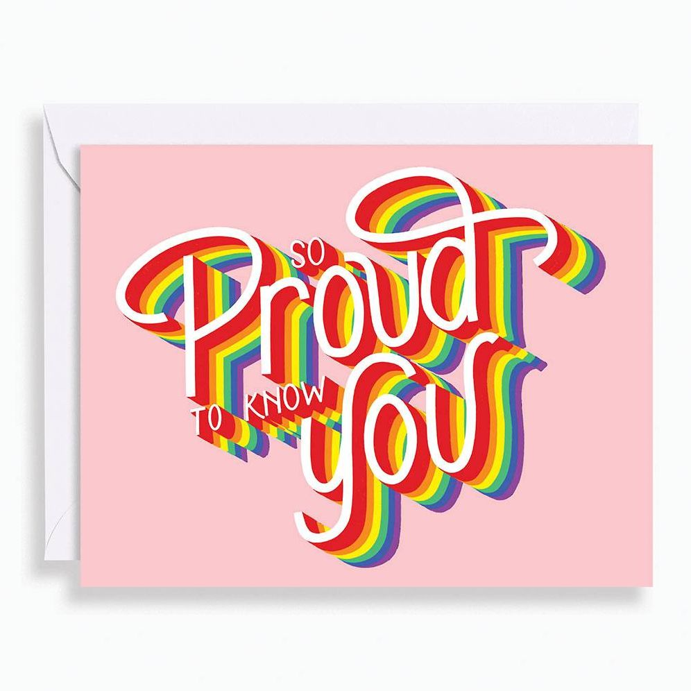 Express your love for someone for exactly who they are are! Featuring bold and brilliantly rainbow text. card reads. So proud to know you! Blank inside. Paired with white envelope. Designed by Paper Source.