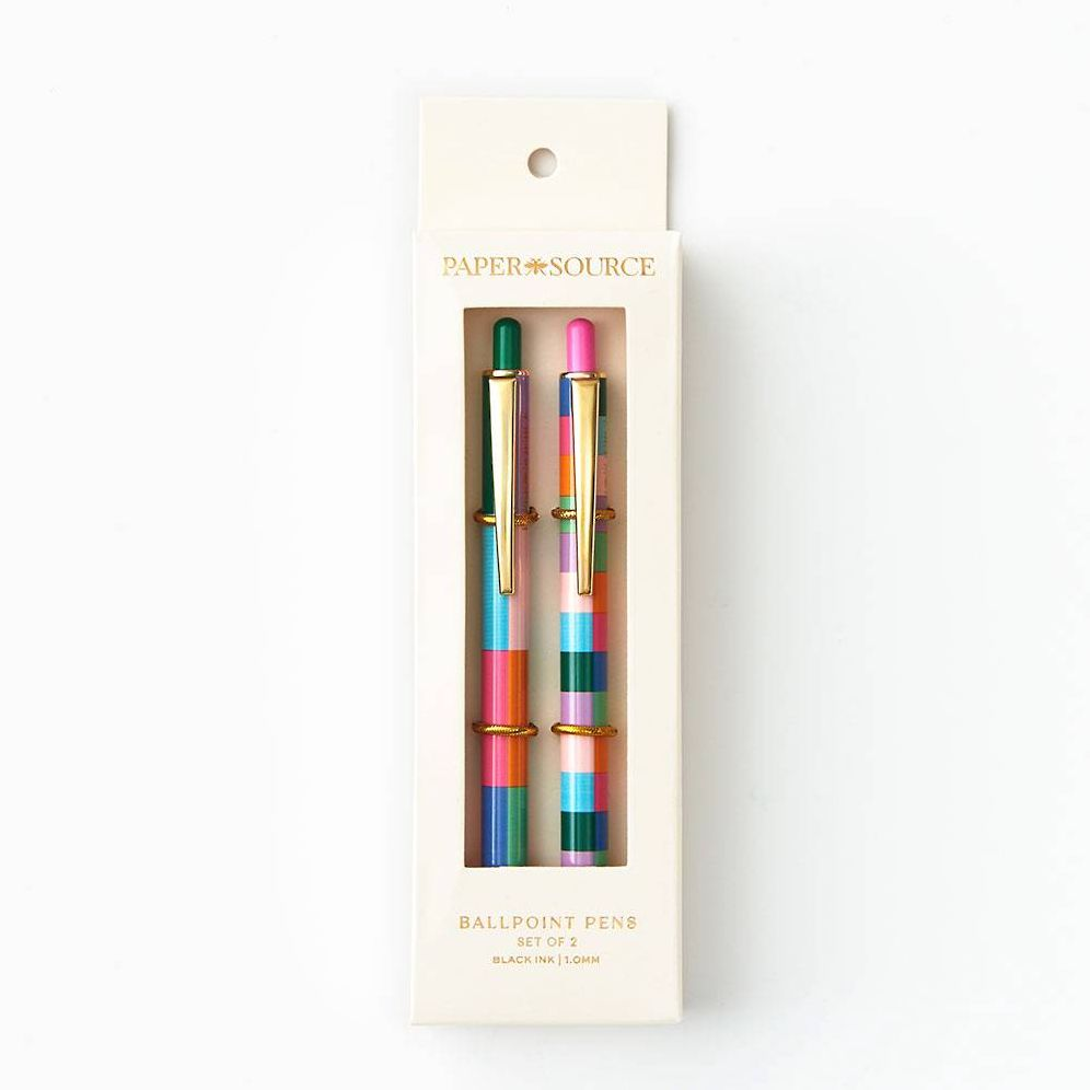 These exclusively designed Paper Source pens will compliment your note taking and to-do lists. journal and stationary writing. and organizational needs. This cheerful 2-pack of pens are bright-colored. satin touch. easy-glide ink. with 1.0MM black ink tips.