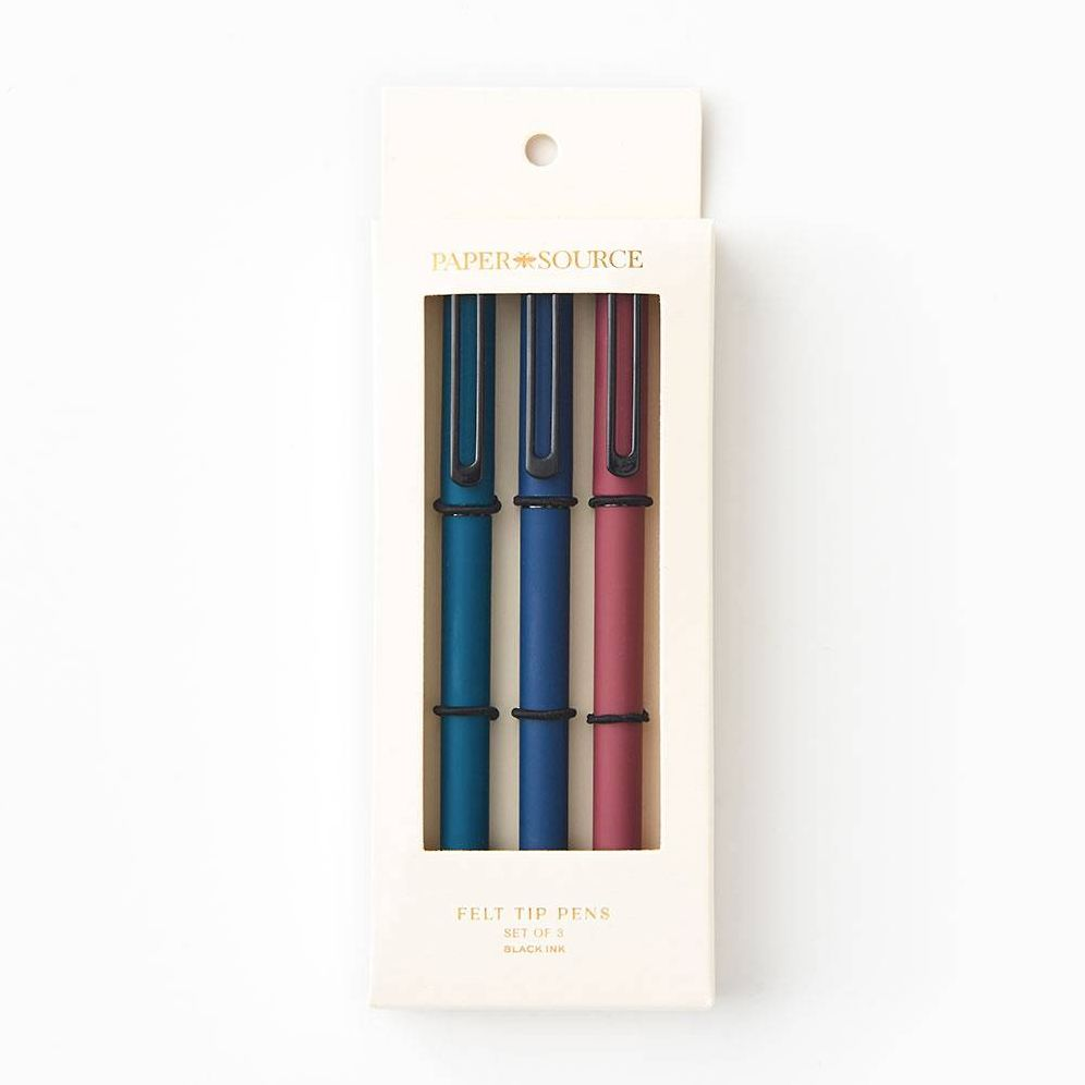 These exclusively designed Paper Source pens will compliment your note taking and to-do lists. journal and stationary writing. and organizational needs. This moody 3-pack of pens are dark multi-colored. soft touch. easy-glide ink. with black felt tips.