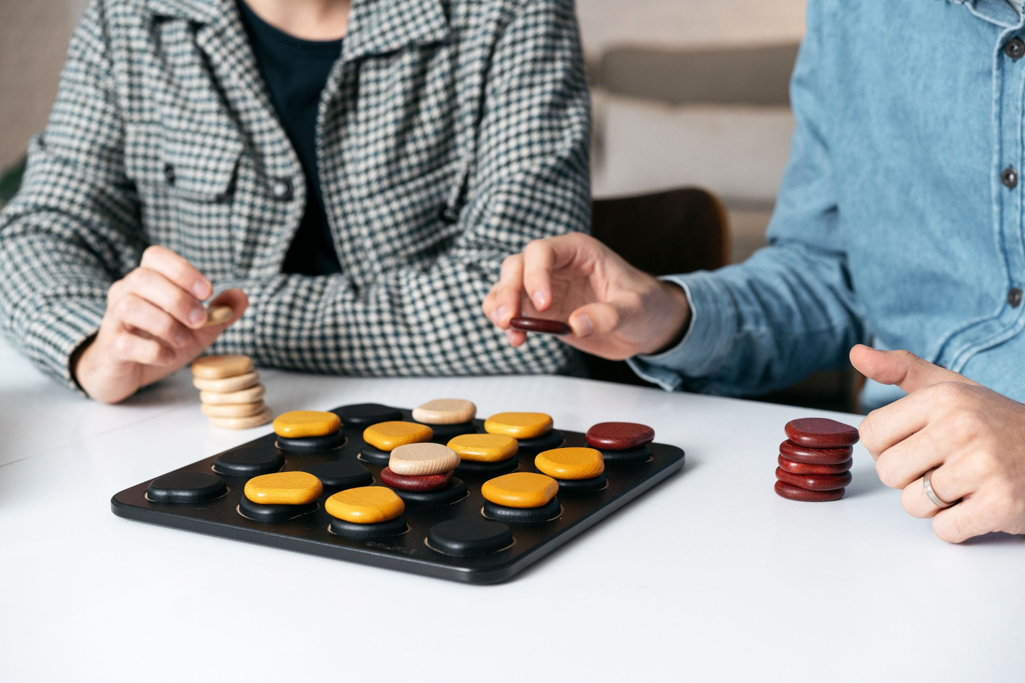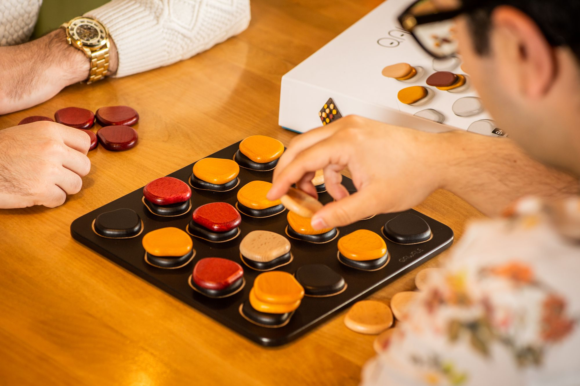 Simple yet tactical. Qawale will rock your idea of strategy games. Lay stones on the path and try to line up four stones in your color. Qawale is inspired by the tradition of stacking stones along trails and paths in nature. As you drop these stones along your path. this incredible game will transport you to a place where strategy and nature come together. Each player takes 8 stones in their color. The third color is neutral and is placed in the 4 corners of the board. On your turn. add a stone on top of any pile and move it. When moving a pile. you must leave a stone on each space you cross. The first player to get 4 of their stones in a row. looking at the board from above. wins the game.