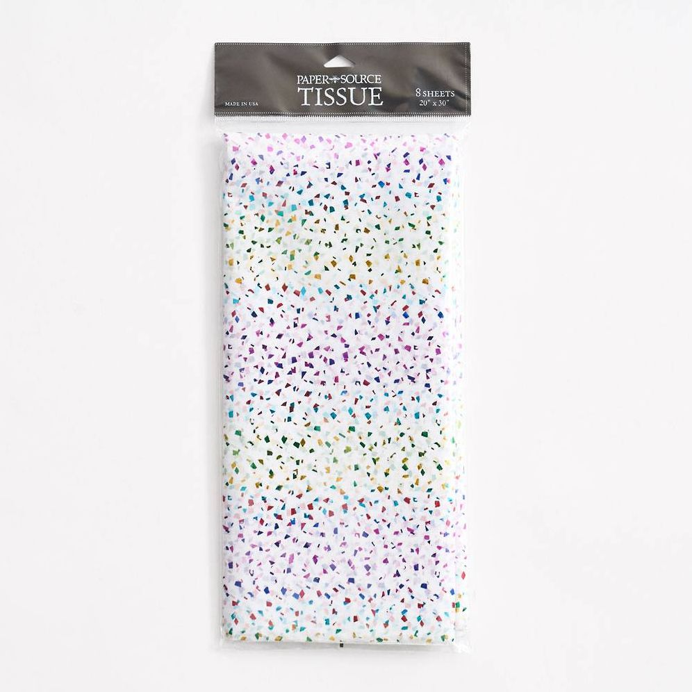 Shimmery rainbow foil flecks look festive sprinkled onto white tissue paper. Add fun and pizzazz to gift bags. boxes and more! Great for crafting. too. Pack of 8 sheets.