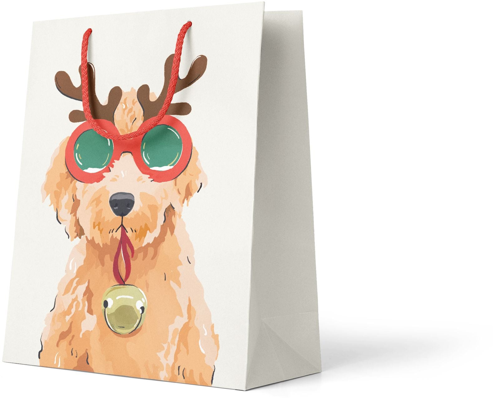 Share holiday cheer with this adorable gift bag featuring a Doodle wearing festive gear. Grab the matching greeting card for a perfect set! From Amy Heitman.