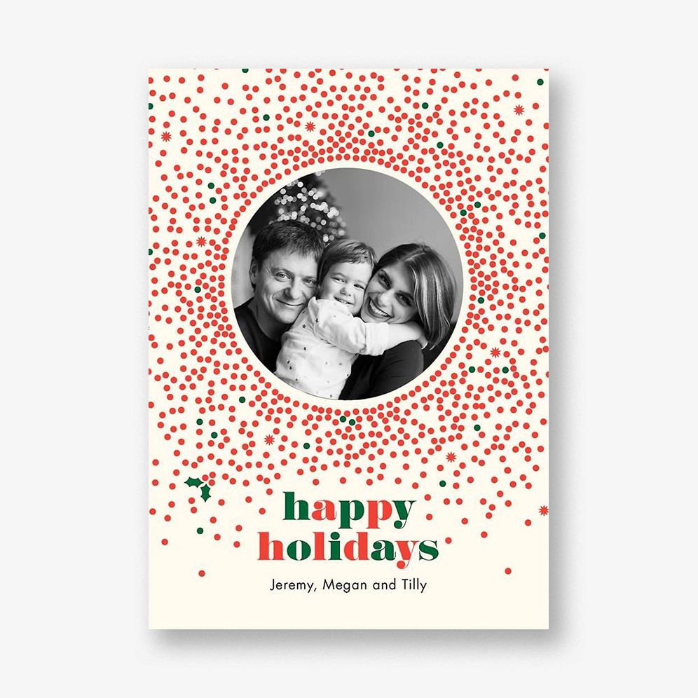 This fun design puts your photo inside of a holiday snowglobe! There’s room for a small sign-off underneath the holiday message.