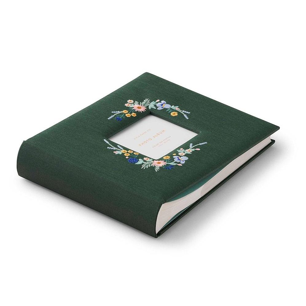 Photo album by Rifle Paper Co. with embroidered. padded linen cover with photo window. acrid-free sleeves. with space for captions and notes.