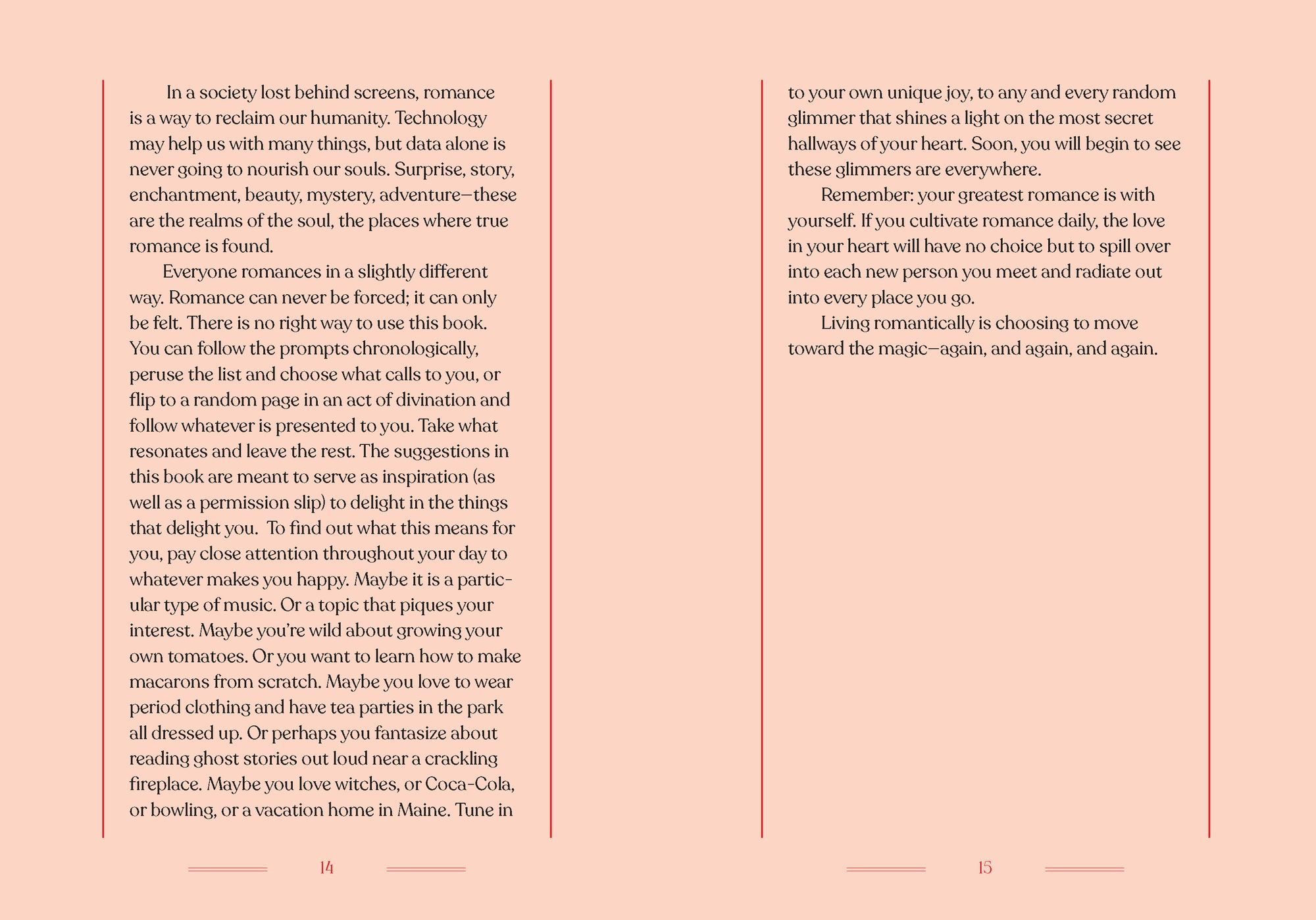 Between the pulls of work. family. friends. and the unrelenting speed at which our world churns. it can be hard to find pockets of joy. Romance the Every Day aims to make the far-more-frequent ordinary moments of our lives a bit sweeter with 52 thoughtful and accessible ideas—one for every week of the year.
