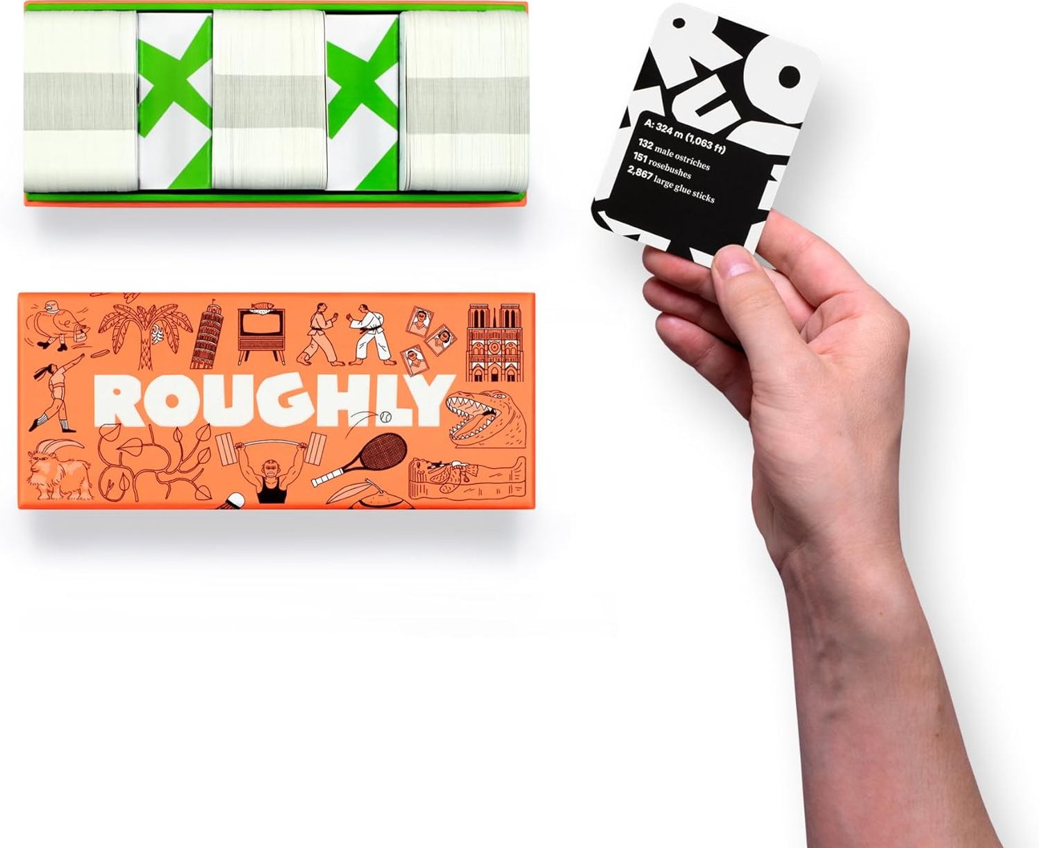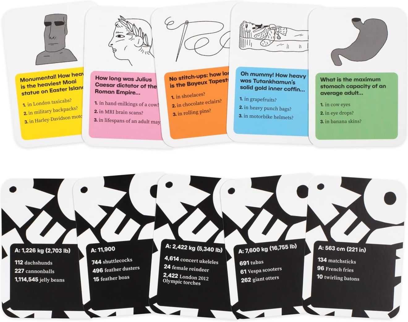 Quick to answer and hilarious to quarrel over. these aren’t your regular quiz questions. With 300 cards and 900 questions to choose from. challenge your opponents to wacky guesstimations like how high the Eiffel Tower is in adult male ostriches. or how long the longest ever human hair was in French fries. Who will get roughly the right answers to win the game?