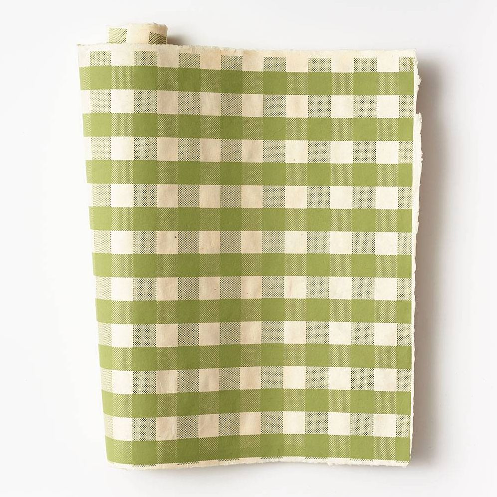 Create a unique wrap or lovely craft project featuring this paper with a subtle gingham pattern in sage and cream. Made from the renewable fibers of the Lokta plant. this fine paper is also a green choice for your projects!
