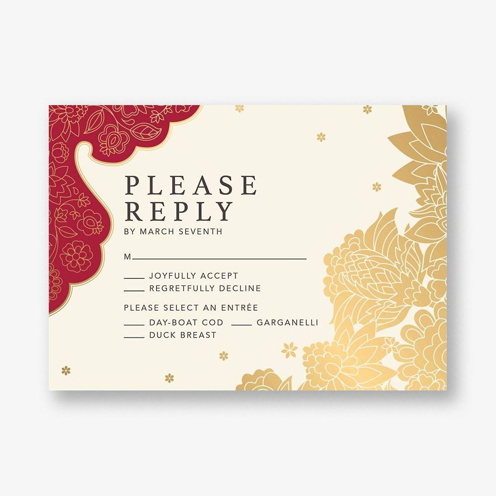 Let guests send their replies in style with the Sanganeri Foil Response Card. featuring lavish golden florals and vivid tones. Designed for you by Paperless Post.