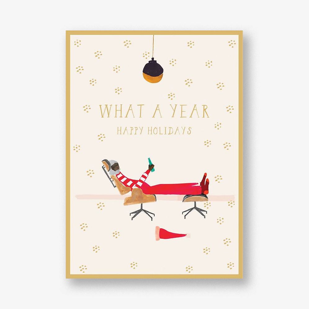 Santa kicks back with his favorite beverage after a long and unprecedented holiday season on this adorable holiday card. designed by Mr. Boddington’s Studio for Paperless Post.