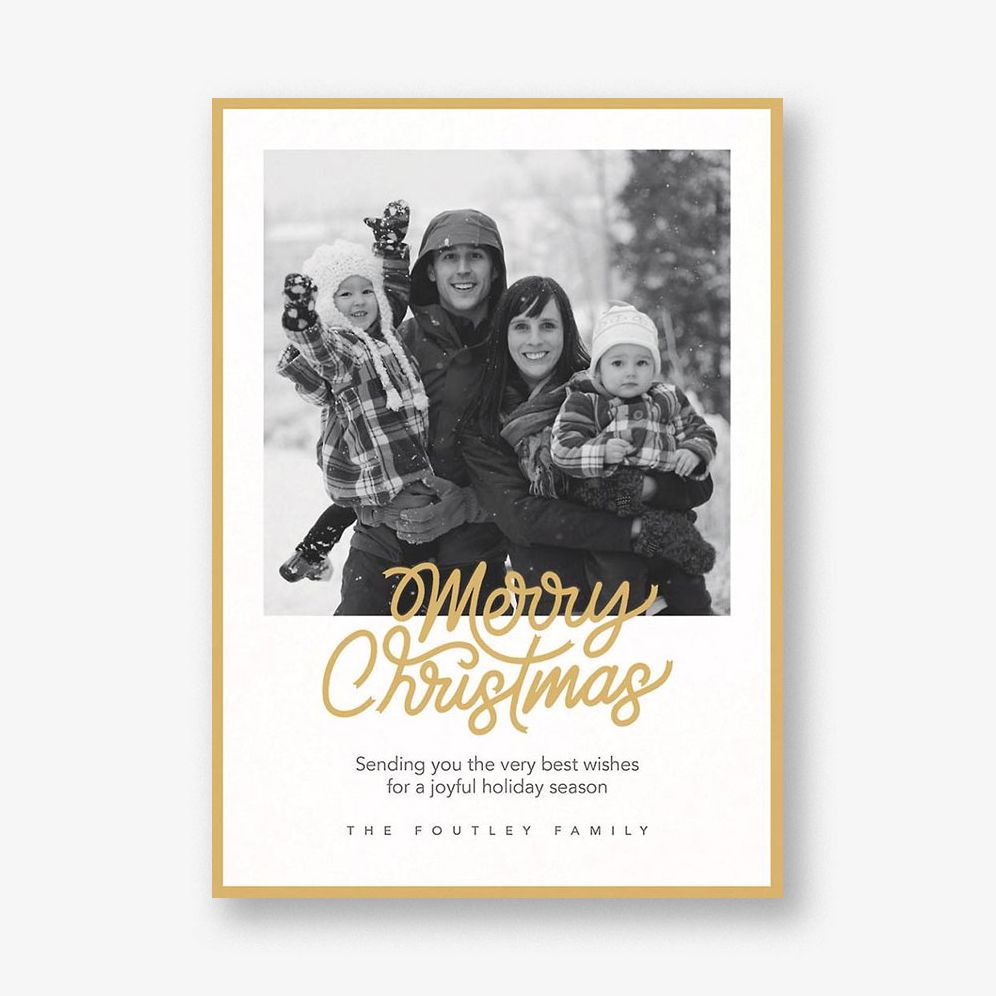 Let those you love know that you’re thinking of them with this personalized holiday photo card by Paperless Post. This card reads Merry Christmas and can be further customized with a message from you and your family. Printed on Mohawk ultra white 120 lb. card stock that is soft to the touch and matches our superfine white envelopes. Paper is FSC certified and made using wind power.