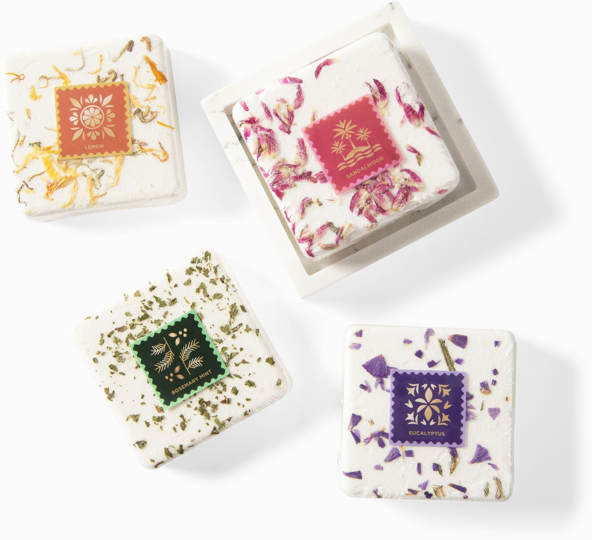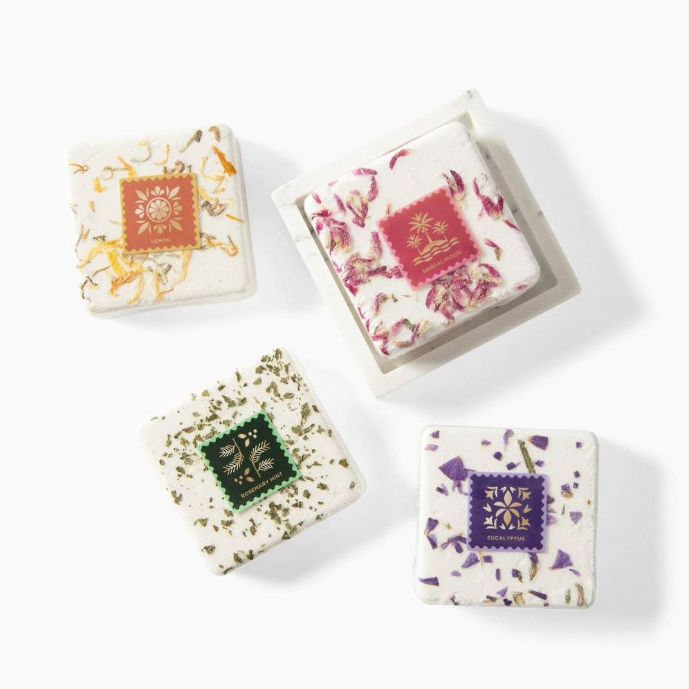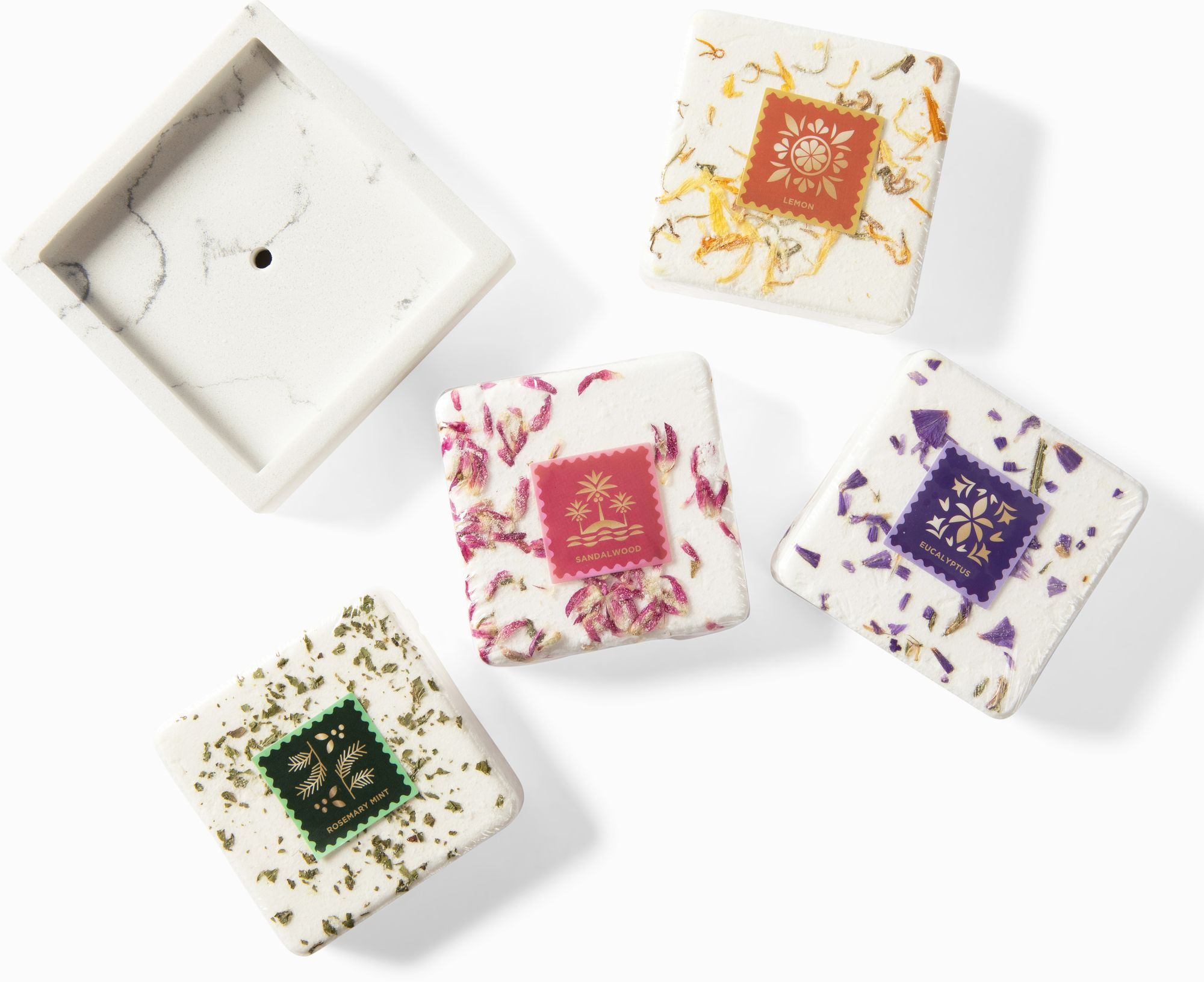 Create a mini-getaway. right in your shower. with our essential oil shower steamer set. Each steamer is carefully crafted to create a sensory experience; the dainty botanicals and the lovely scents. The elegant dish holds the steamer on your shower floor and will give you spa vibes. The perfect gift for yourself or someone who needs a getaway moment.