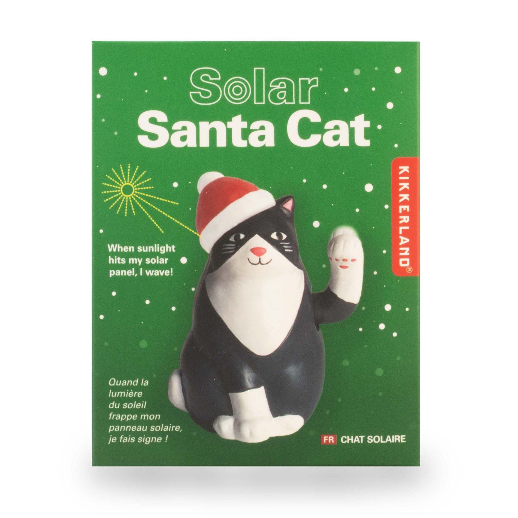Powered by sunlight. this funny figurine is a jolly cat wearing a santa hat that waves at you when in direct sunlight.