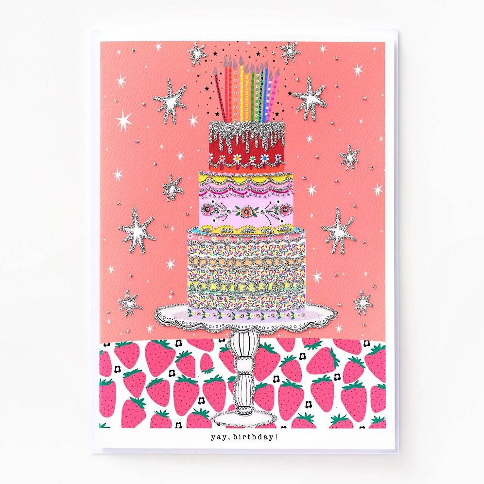 Yay! Send this festive card to celebrate a birthday. Features silver glitter and painted details.