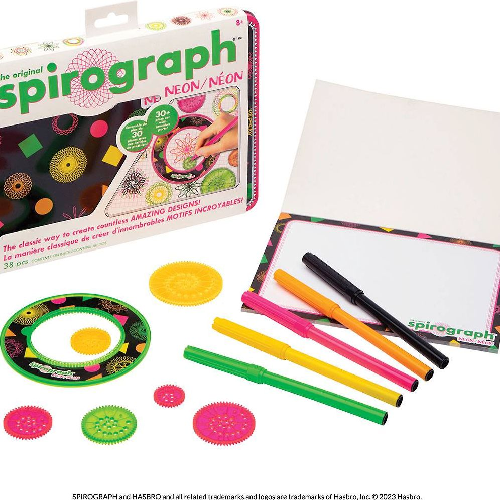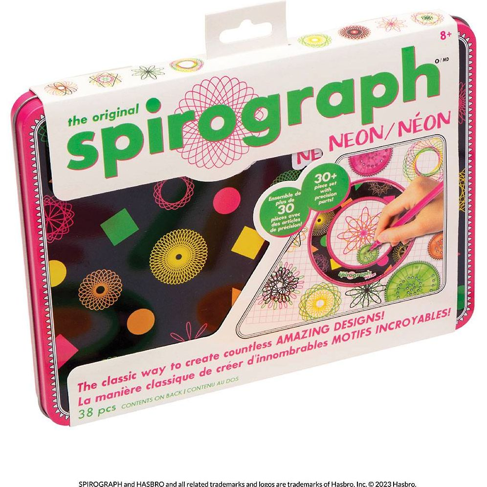 The classic way for aspiring artists to create millions of amazing designs is now in a NEON tin! Draw bold Spirograph designs in bright neon colors with vibrant wheels to match! Use on its own or mix and match with other Spirograph design pieces for even more design possibilities. The precision-engineered Spirograph gears work with the three design pens included in the set as well as with most standard pens. markers. and pencils. This kit is for ages 8+. Includes 1 Spirograph ring. 6 wheels. 5 art markers. 25 sheets of design paper. 1 storage tray. design guide.