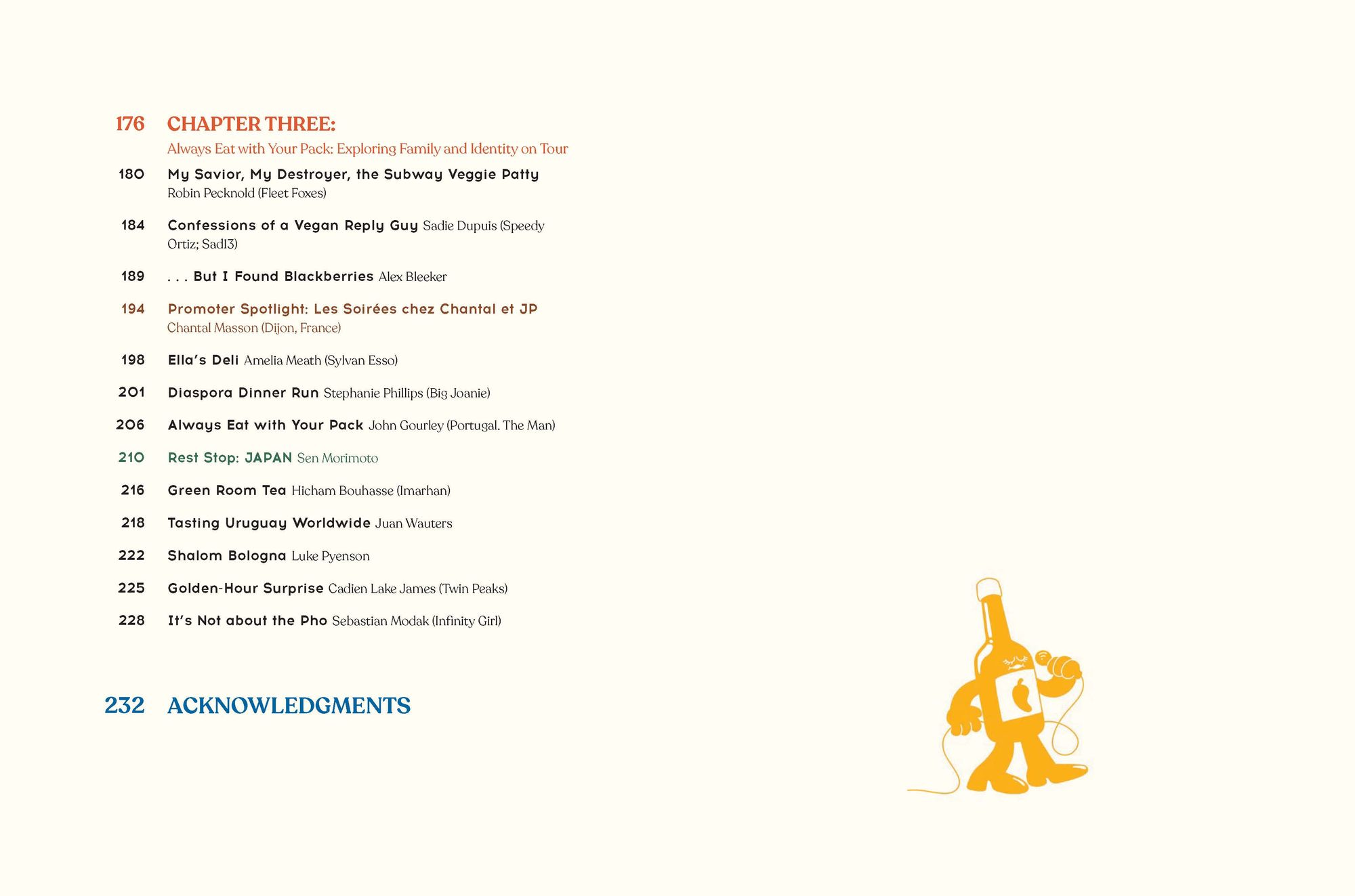 In addition to wide-angle meditations about eating on tour. Pyenson and Bleeker have gathered stories that take place on five continents. in private homes and street-side stalls. in temples of fine dining and in actual temples. backstage and in the van. early morning and late at night. Stories that deal with the best parts of touring: meaningful cultural exchange. hospitality-induced euphoria. and the opportunity to build relationships around the world. And the worst: loneliness. exhaustion. estrangement from family and friends. struggles with disordered eating. and unsteady access to medical care.