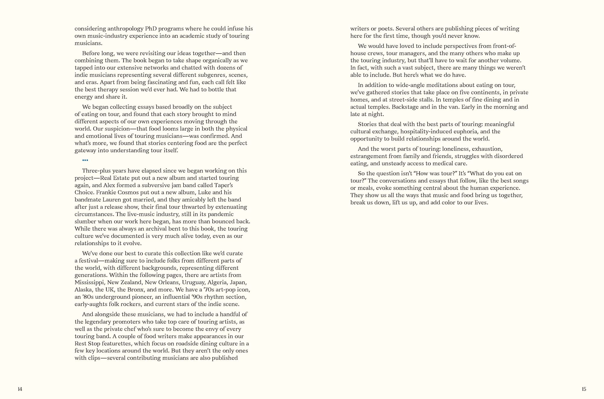 So the question isn’t. How was tour? It’s. What do you eat on tour? Like the best songs or meals. these conversations and essays evoke something central about the human experience. They show us all the ways that music and food bring us together. break us down. lift us up. and add color to our lives.
