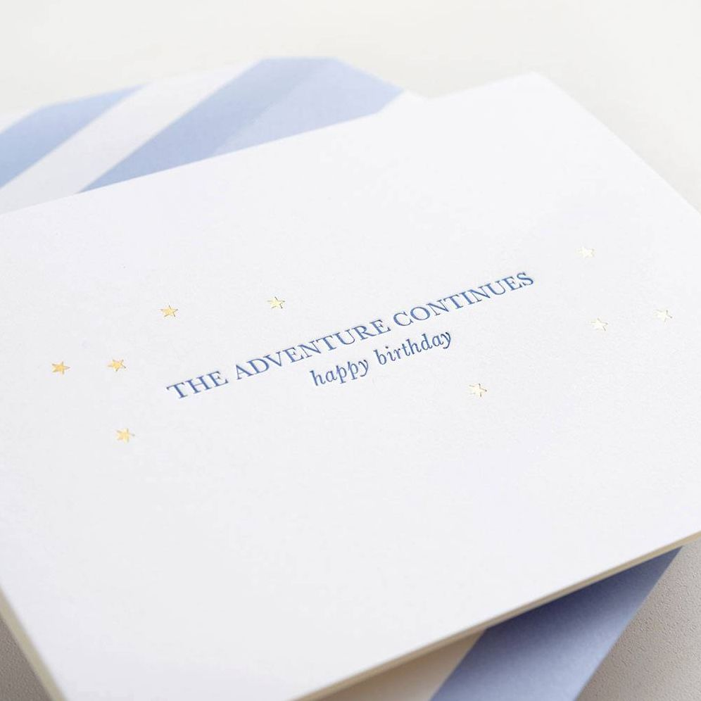 This sweet birthday card reads. The Adventure Continues. Happy Birthday. Letterpress printed with gold foil stars. Accompanied by blue and white striped envelope. Folded card. Blank inside. By Sugar Paper.