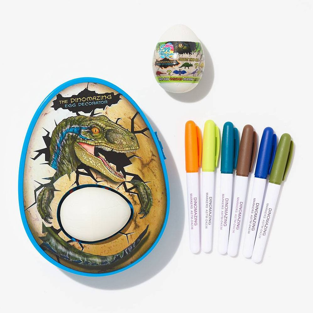 The DinoMazing Egg Decorator can make anyone into a paleontologist! Put one of the two mystery eggs into the machine and the unique spinning action will help create colorful designs while egg-sposing the cracks. Open the eggs to reveal non-sticky slime and a mystery dinosaur! Want to make your own dinosaur hybrid? Each mystery dinosaur has interchangeable limbs so you can do the dino swap! The DinoMazing Egg Decorator includes 1 decorating machine. 2 Mystery Dino Eggs and 6 colorful non-toxic markers. Collect all mystery dinosaurs. Sold separately. 3 AA batteries required/not included.