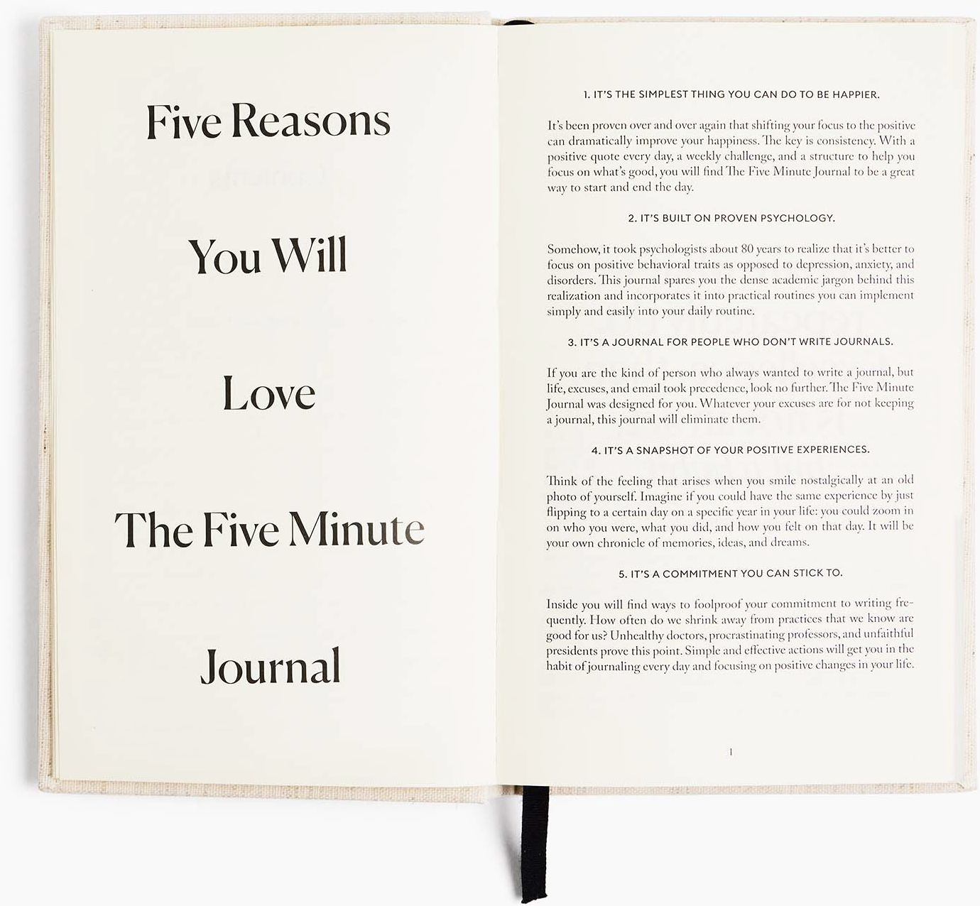 Elevate yourself. Be happier. Improve relationships. Shift your mind to state of optimism. You could be the next amongst thousands of others to hone your ability to focus on the good in life. The Five Minute Journal’s approachable and structured exercises will lead you down a path toward an enhanced version of the person you already are.