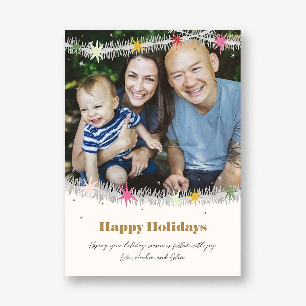 Add a garland of shimmer and shine to your favorite photo with this chic design from Paperless Post. Printed on Mohawk 120.0 lb Superfine Ultra White. This paper is FSC certified. with 30% post consumer recycled content. and made using wind power. Looking for something speedier than snail mail? You can with our partners at Paperless Post.